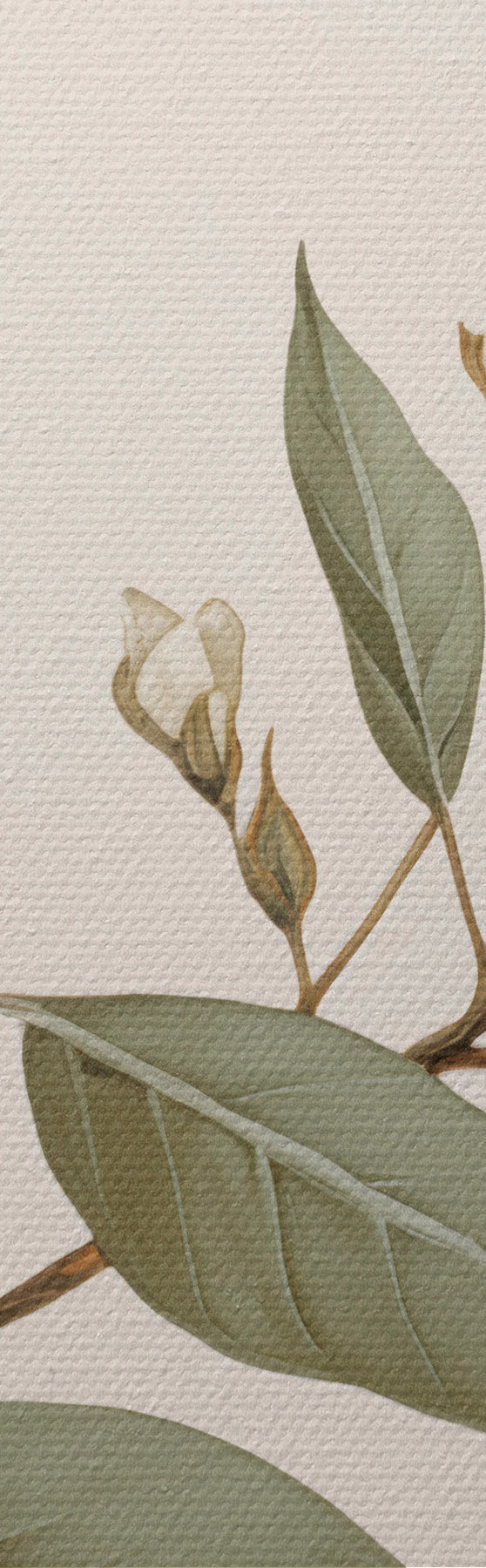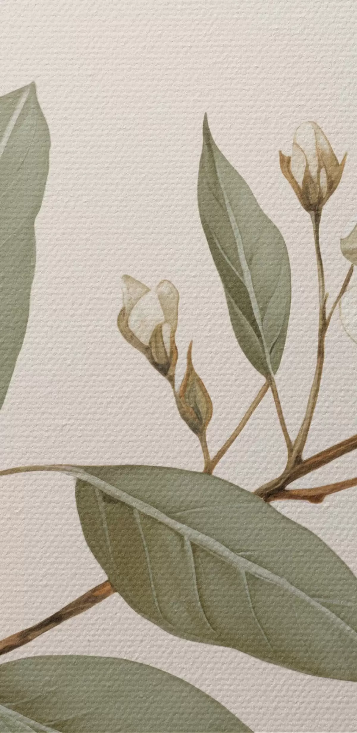 Obraz Jemná větvička s bílými květy a zelenými listy na světlém pozadí, s jemnými detaily a elegantním stylem. Č. s42583