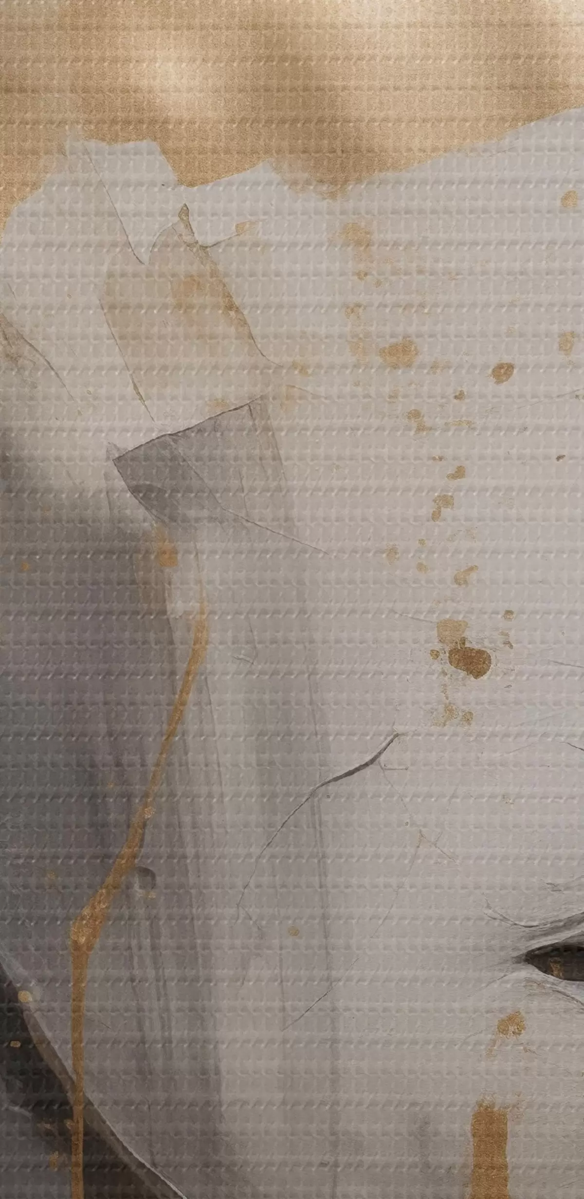 Obraz Abstraktní portrét ženy s důrazem na zavřené oči a rty, provedený v černobílých odstínech s dynamickými tahy štětcem v teplých barvách. Č. s42626