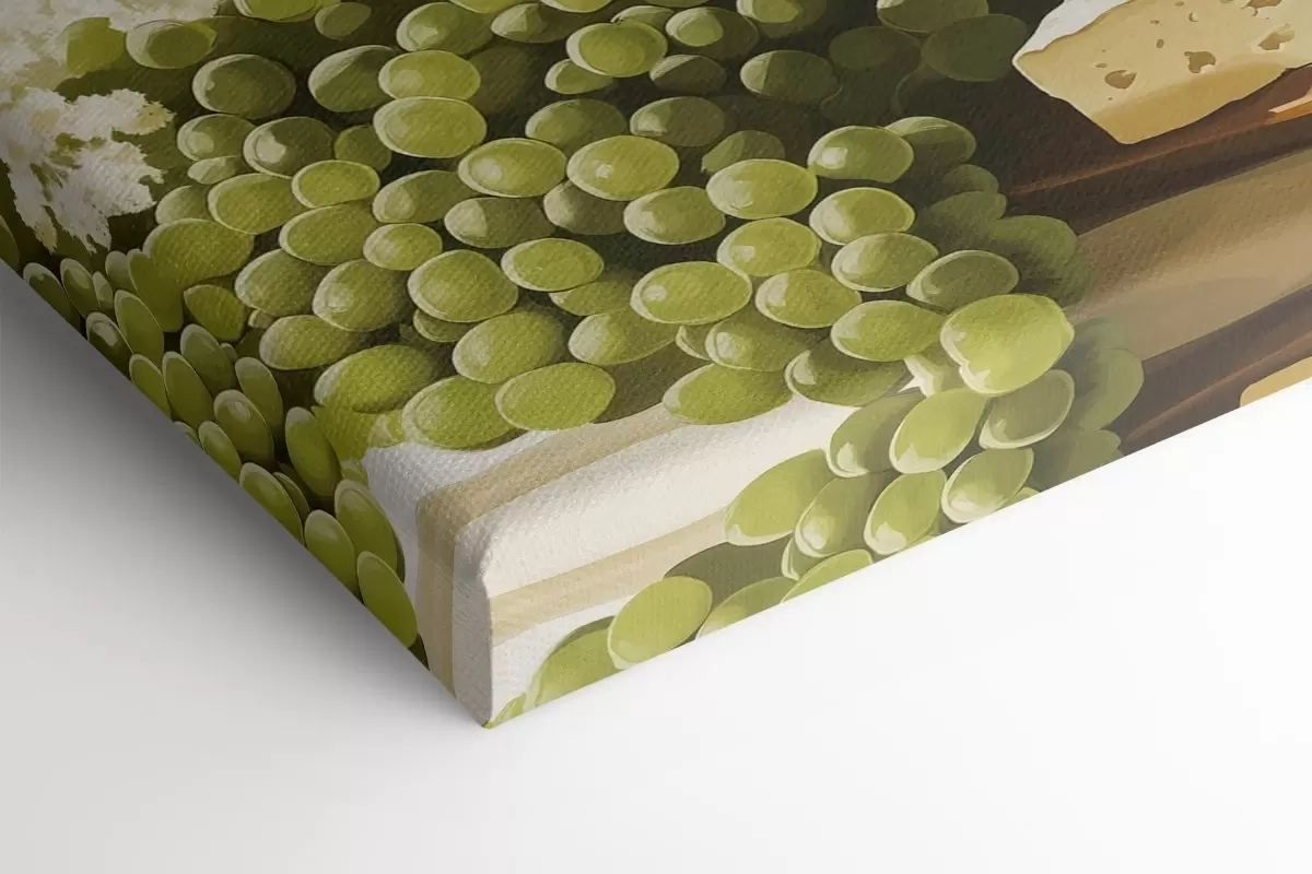 Obraz Hrozny se sýrem, láhev vína, vinobraní, bílé květy Č. s43052