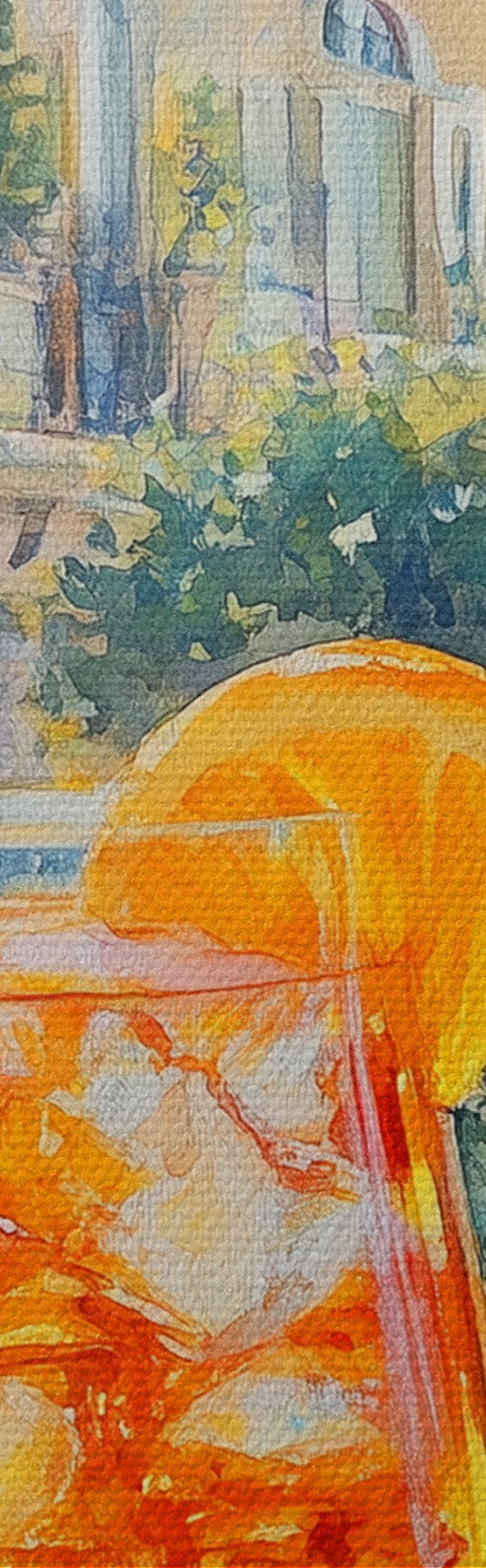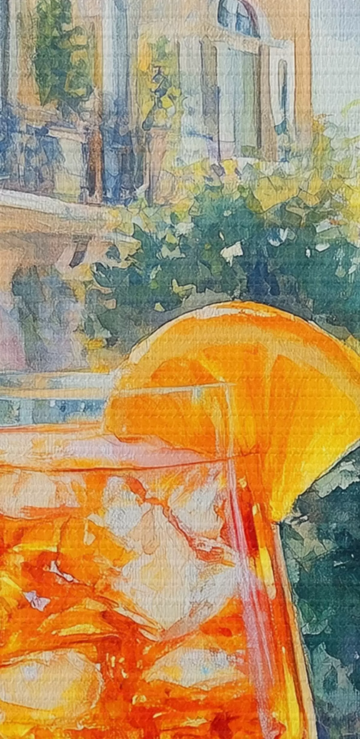 Obraz Koktejl s pomeranči, akvarelový styl, Itálie, Aperol Spritz, architektura, letní zahrada Č. s43061