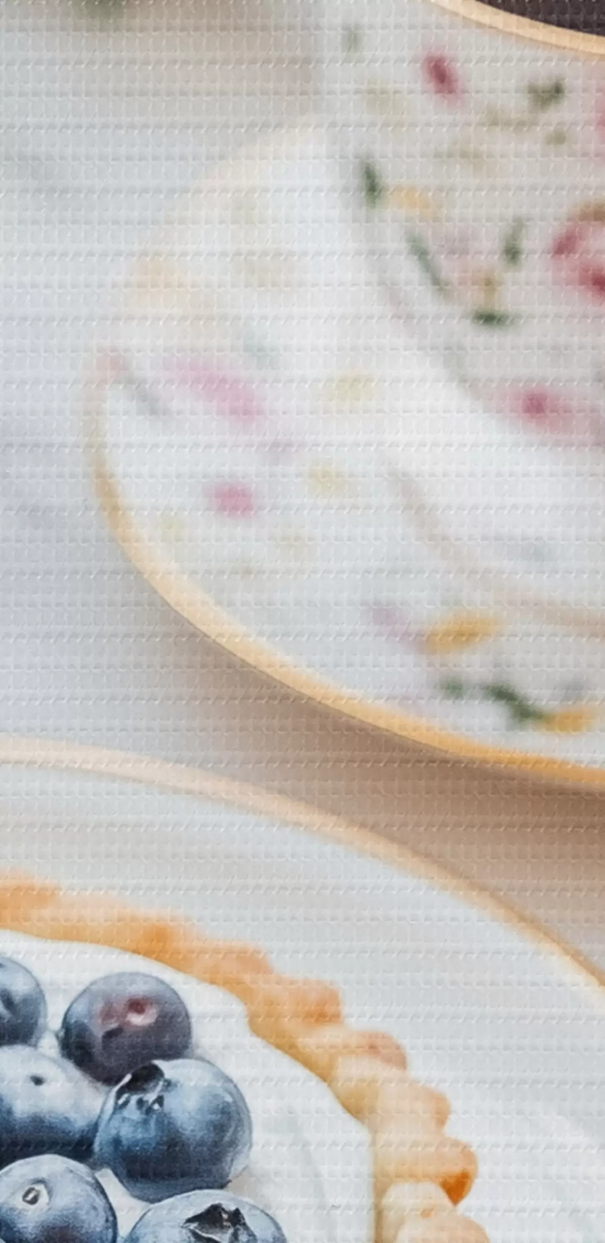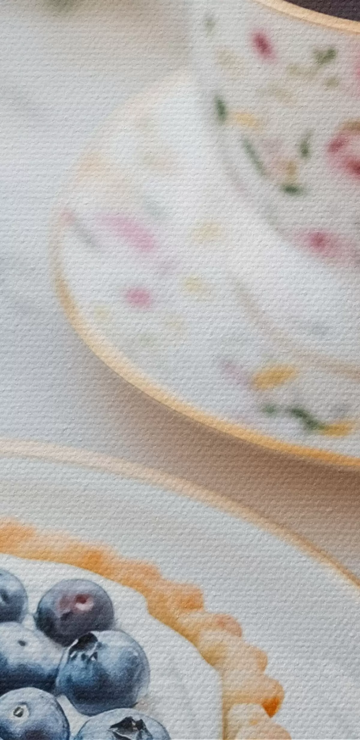 Obraz Borůvkový dortík s šálkem čaje, boho styl, růžové růže Č. s43066