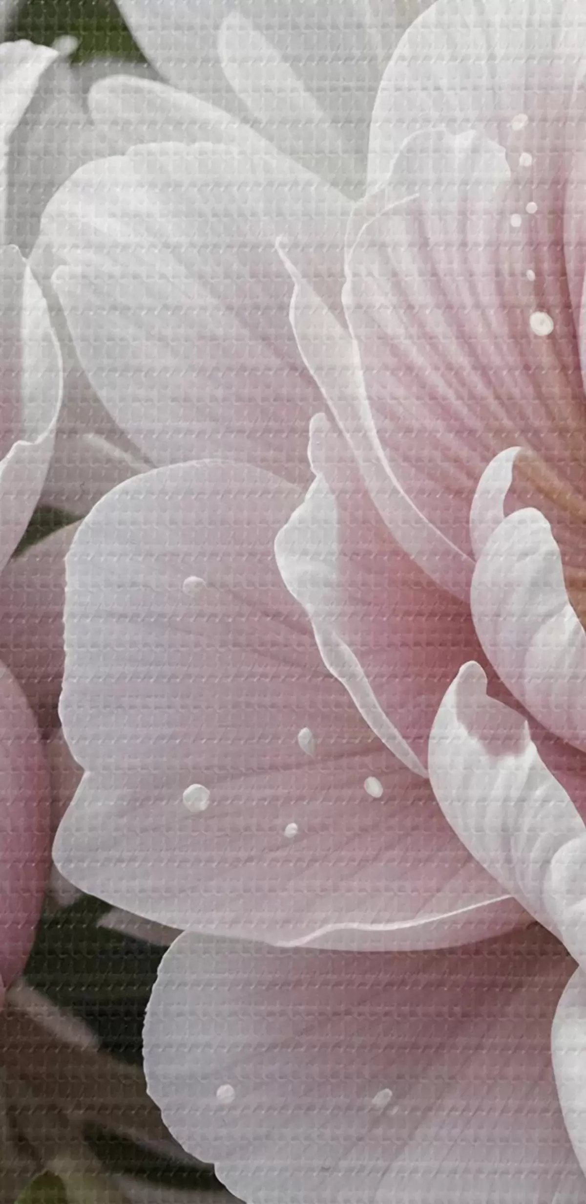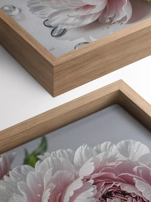 Obraz Světle růžové a bílé pivoňky s kapkami vody na okvětních lístcích, pozadí je bílý povrch Č. s43158