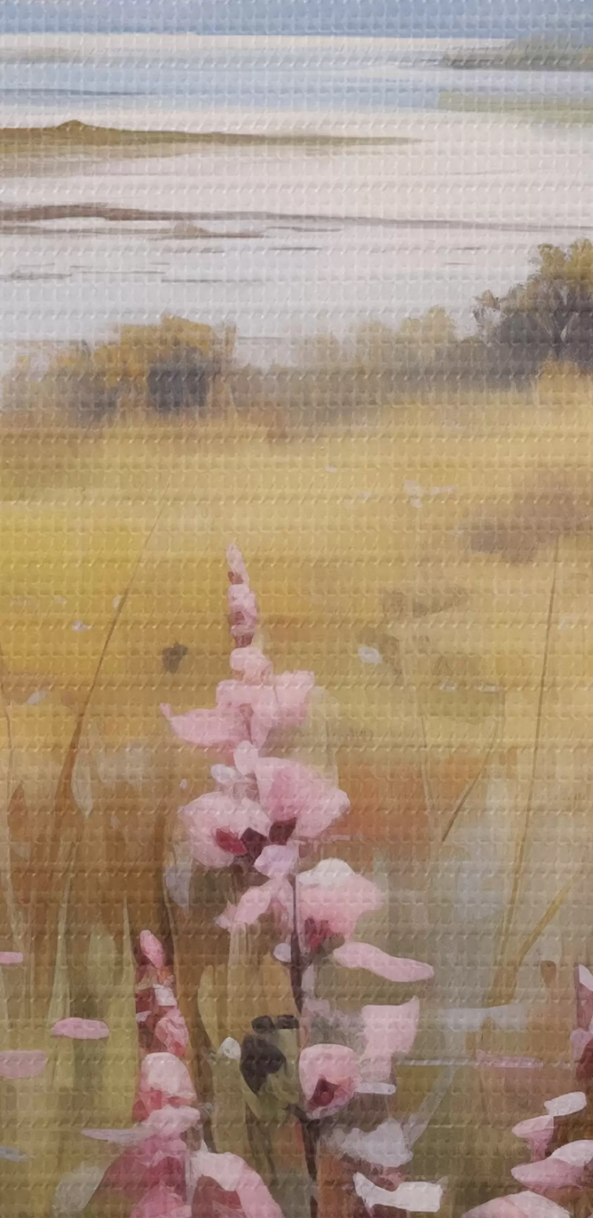 Obraz Krajina s polem růžových květů, jezerem a horami v pozadí, pod zataženou oblohou Č. s43165