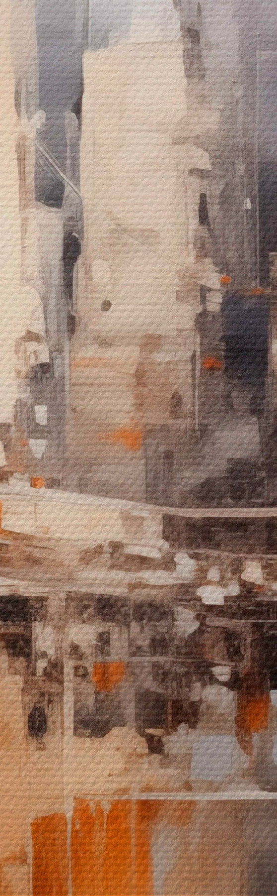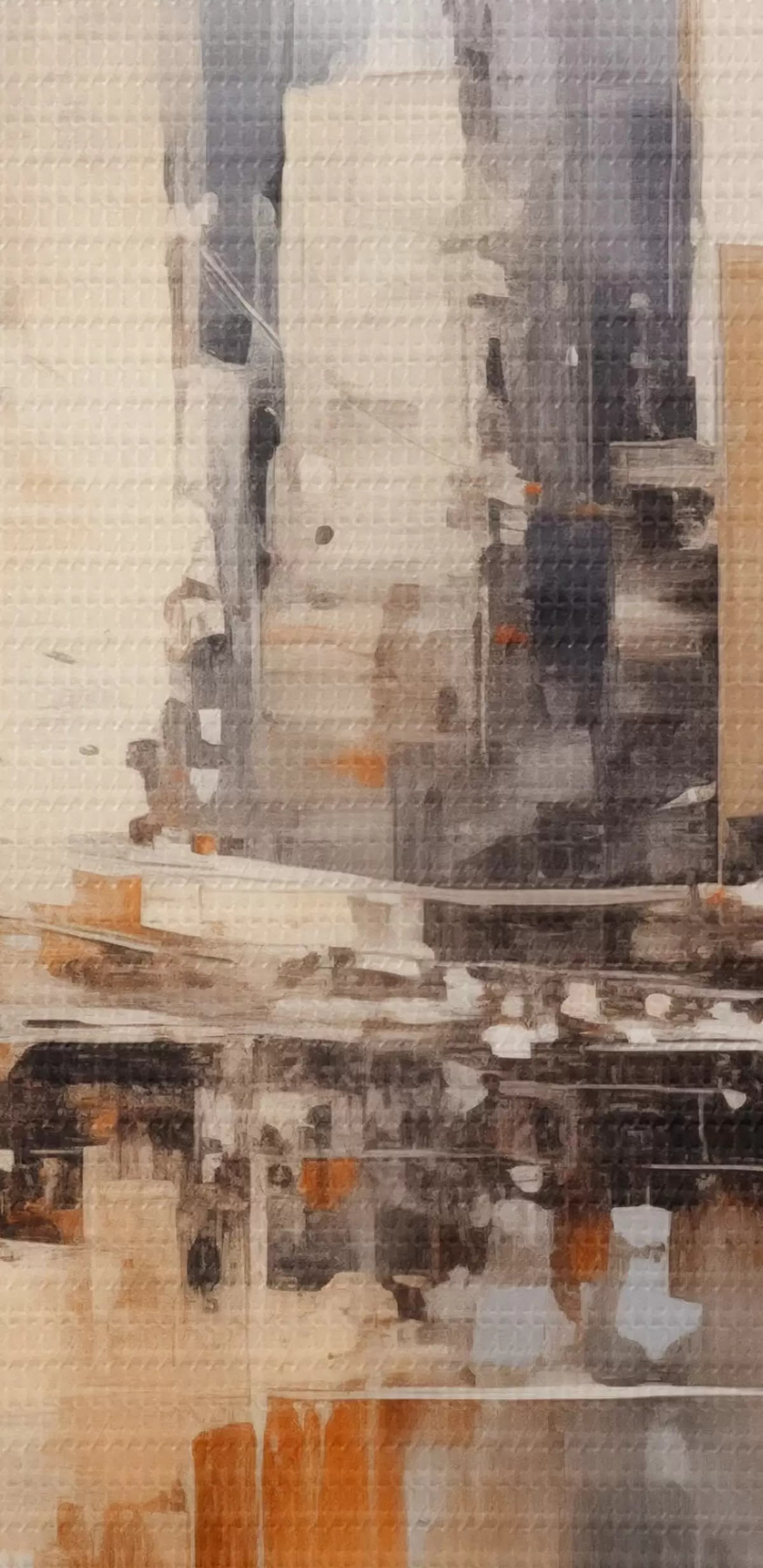 Obraz Abstraktní malba městské krajiny s vysokými budovami v odstínech hnědé, šedé a bílé barvy , odrážející se ve vodě pod nimi Č. s43168