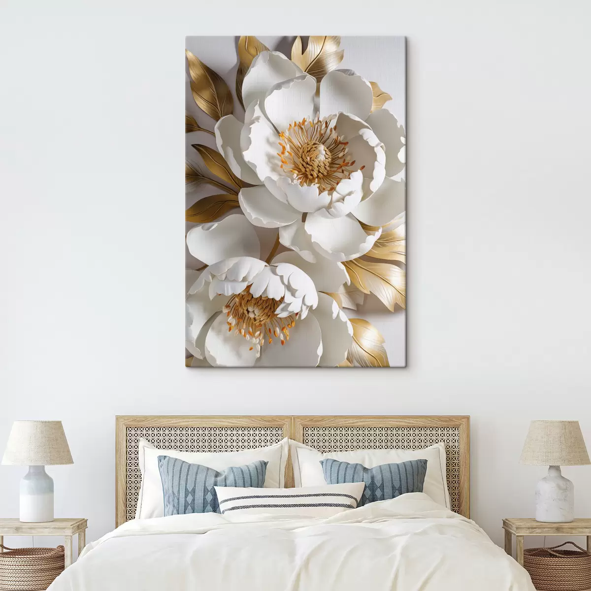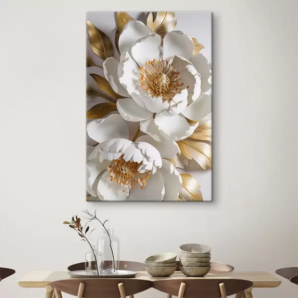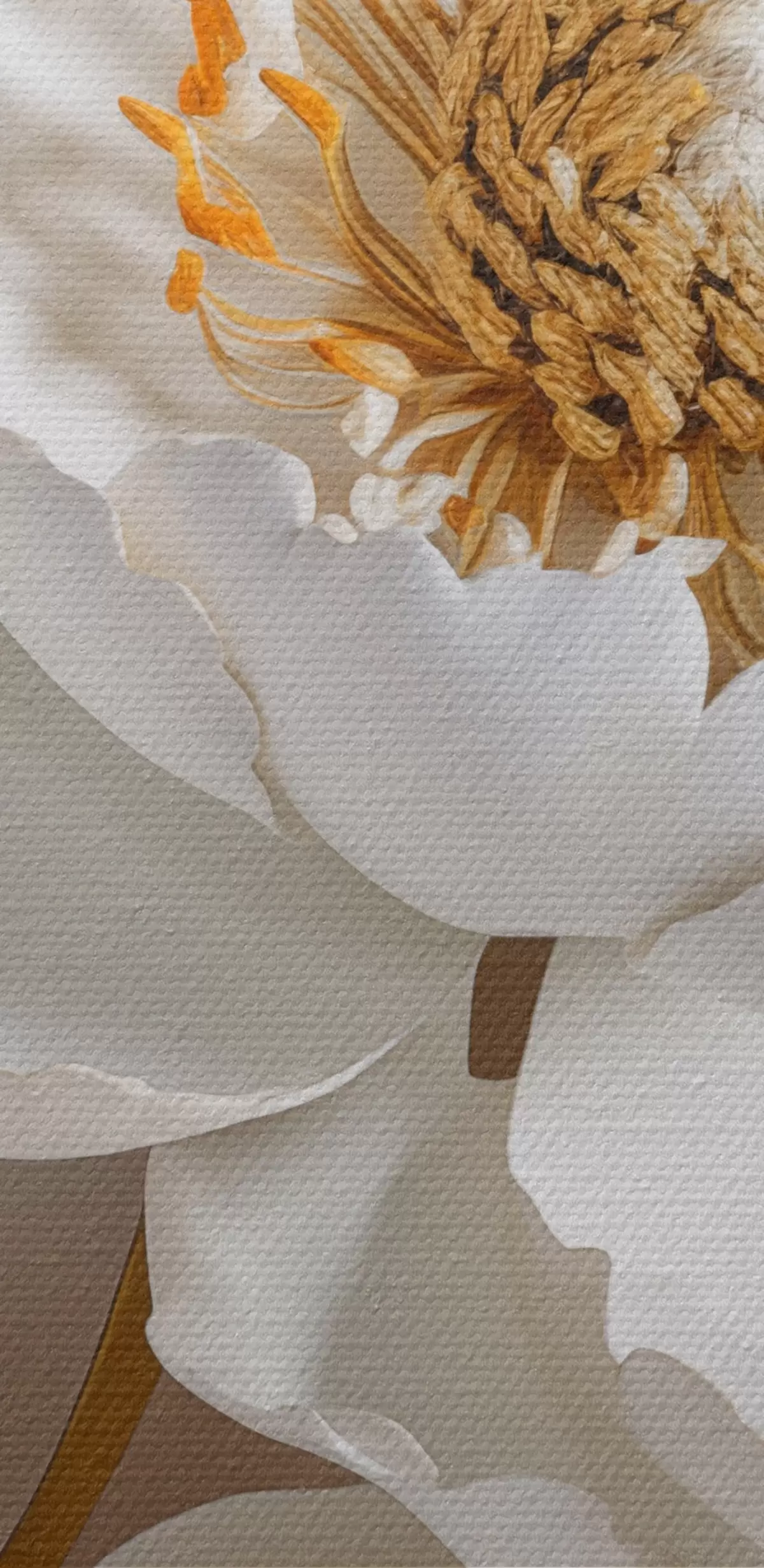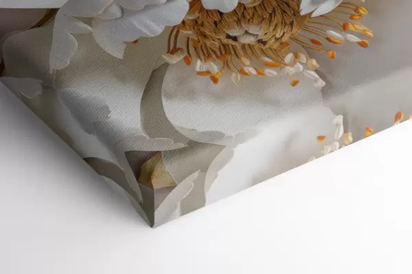 Obraz Bílé jemné detailní dekorativní květy pivoněk se žlutými listy, pozadí je světle šedé barvy Č. s43176