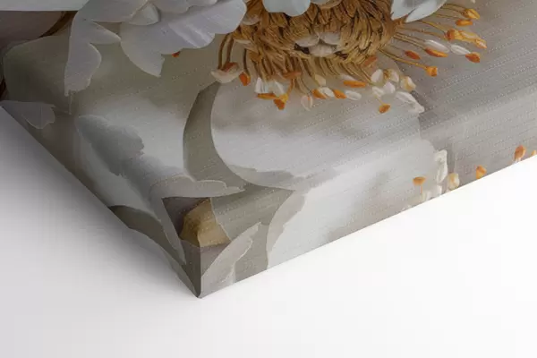Obraz Bílé jemné detailní dekorativní květy pivoněk se žlutými listy, pozadí je světle šedé barvy Č. s43176