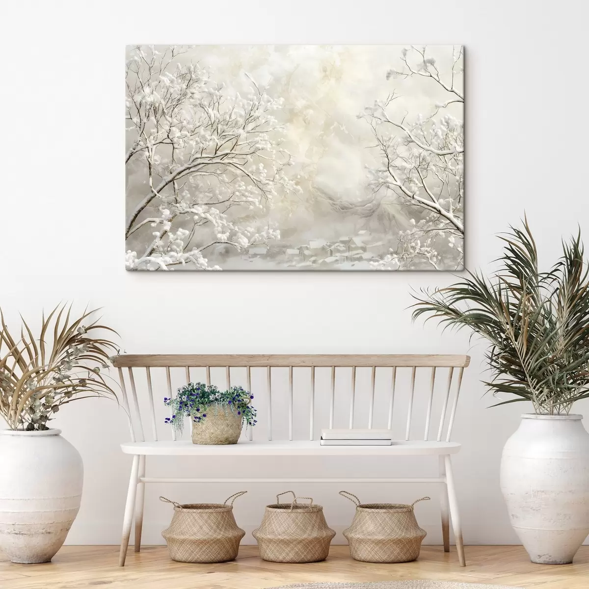 Obraz Zimní větve se sněhem na pozadí zimní vesnice Č. s43321