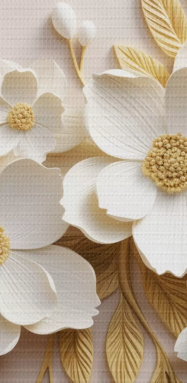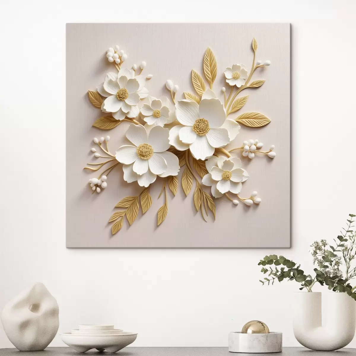 Obraz 3D bílé květiny s listy na krémovém pozadí Č. s43383