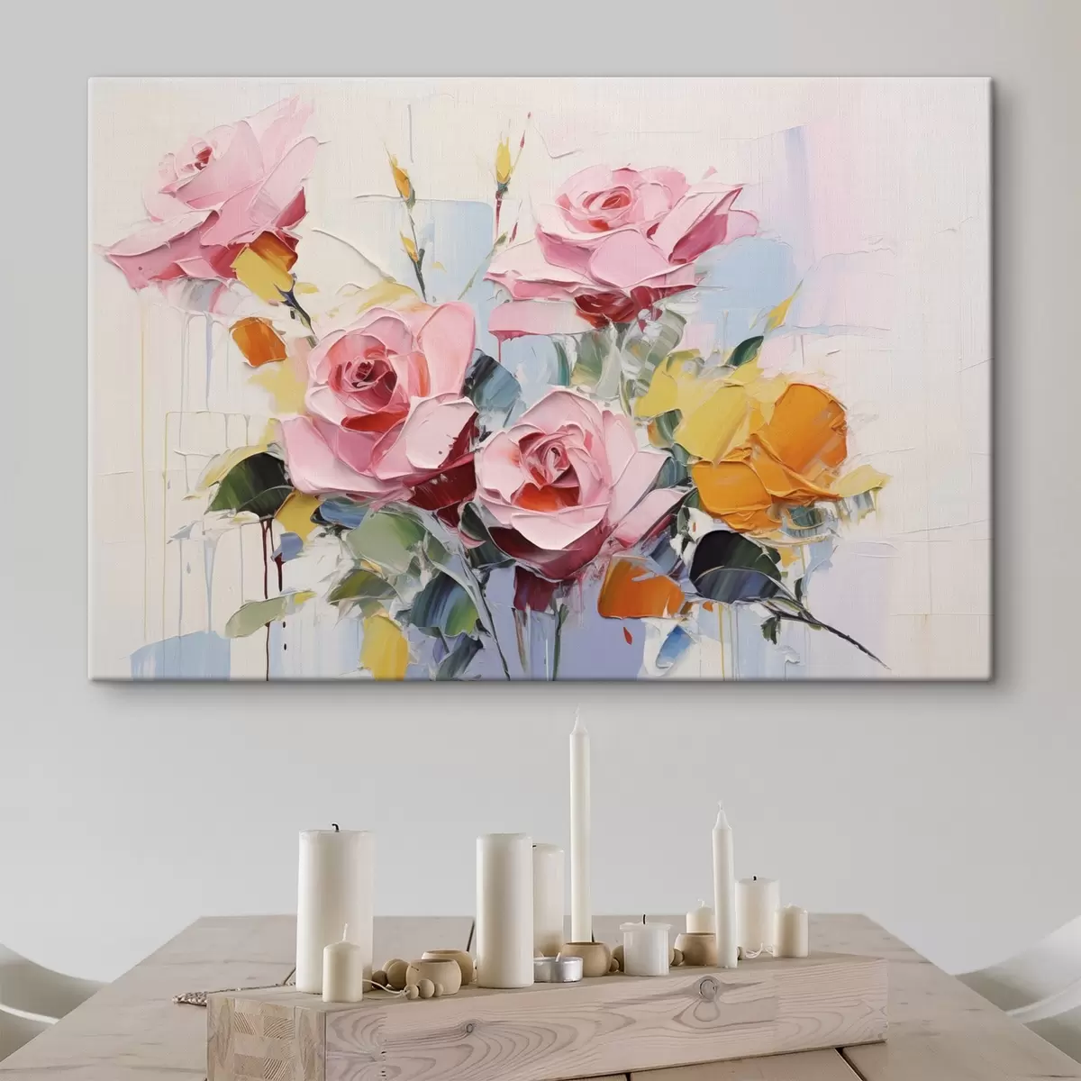 Obraz Moderní abstraktní umění růžových a žlutých růží s listy, husté tahy štětcem, imitace olejomalby, pastelové barvy Č. s43392