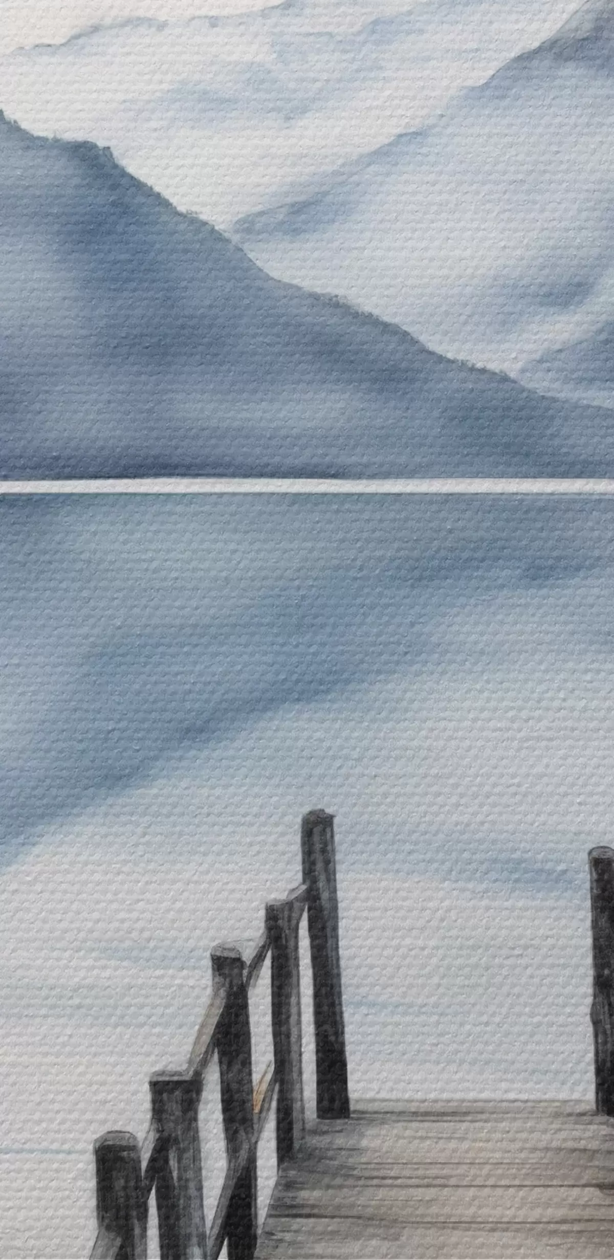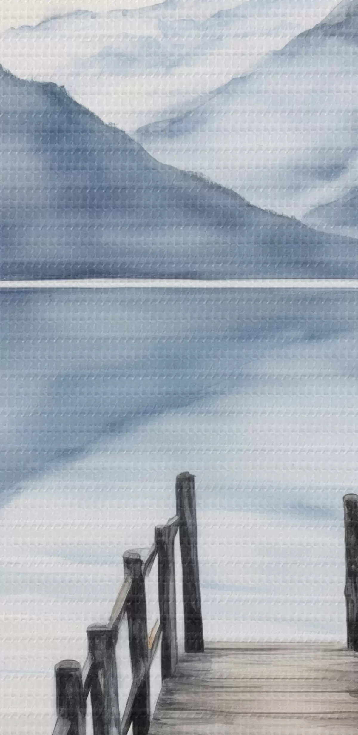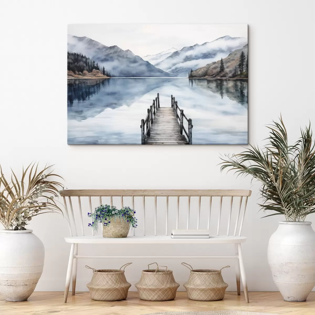 Obraz Dřevěné molo se rozprostírá na klidném jezeře, obklopeném horami a stálezelenými stromy, akvarel Č. s43405