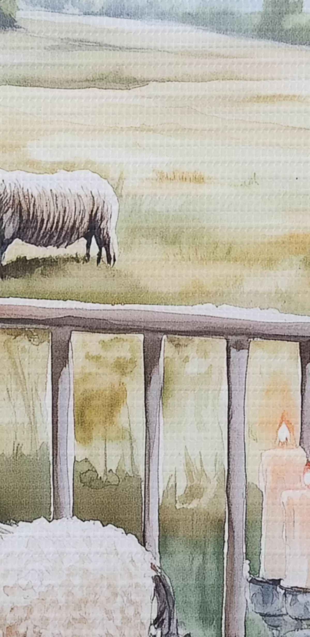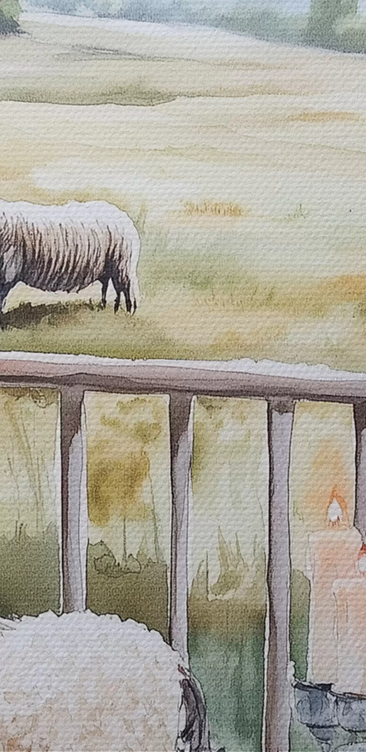 Obraz Venkovská farma s ovcemi, pole, rustikální květiny, akvarelový styl Č. s44014