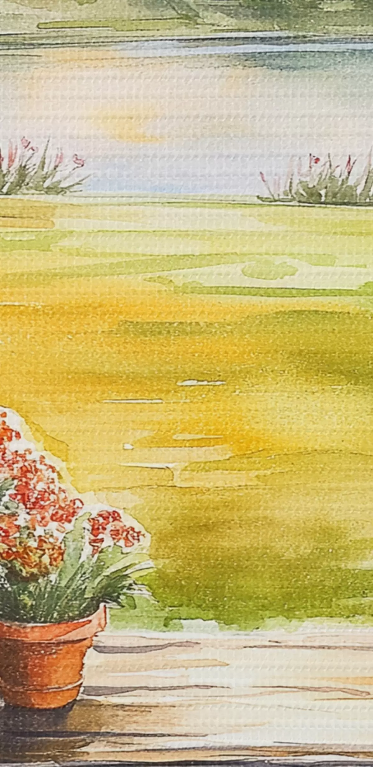 Obraz Vesnice při západu slunce, rustikální, letní květiny, jezero, akvarel Č. s44016