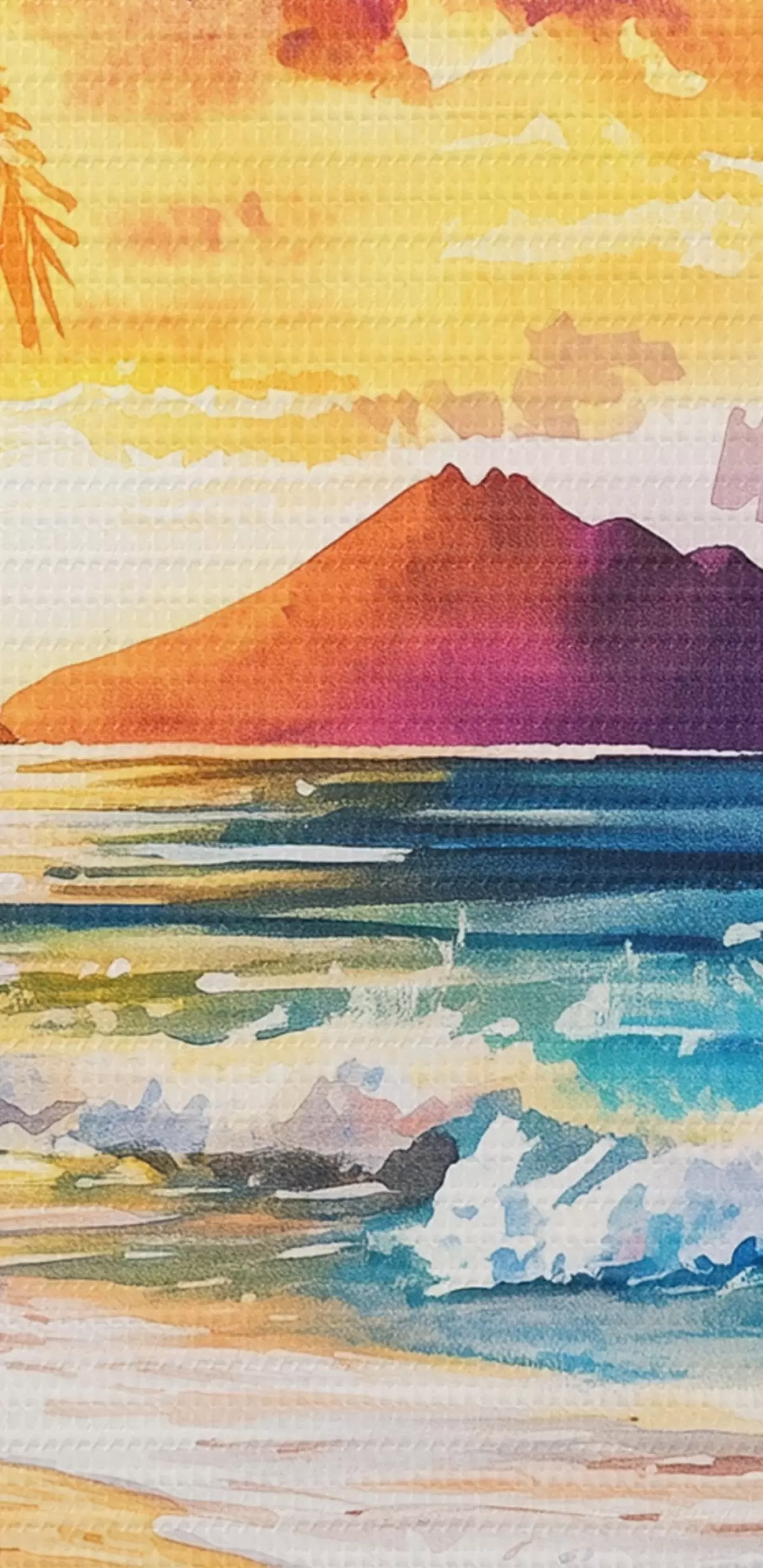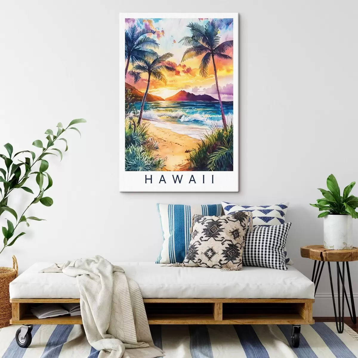 Obraz Západ slunce na ostrově Hawaii, palmy, oceán, barevná obloha, akvarelový styl Č. s44142