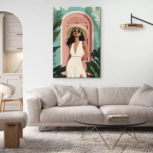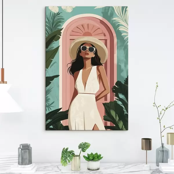 Obraz Žena ve slunečních brýlích a klobouku, tropická příroda, architektura Č. s44152
