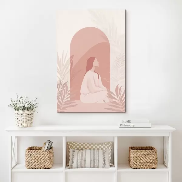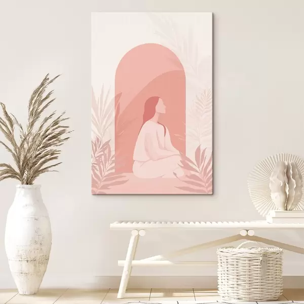 Obraz Žena v meditaci, plochý styl, tropické rostliny, růžové barvy Č. s44154