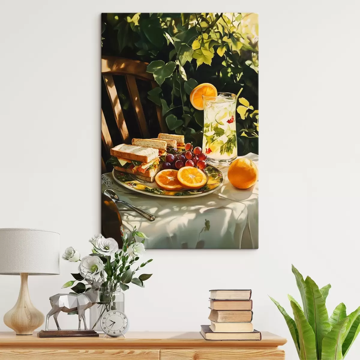 Obraz Estetický piknik v letní zahradě, sendviče, pomeranče, limonáda Č. s44306