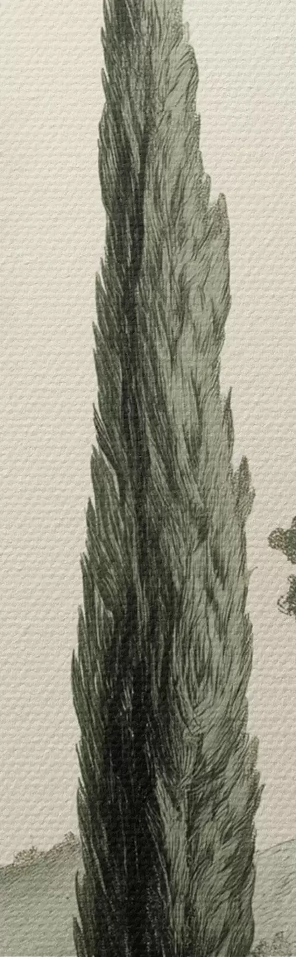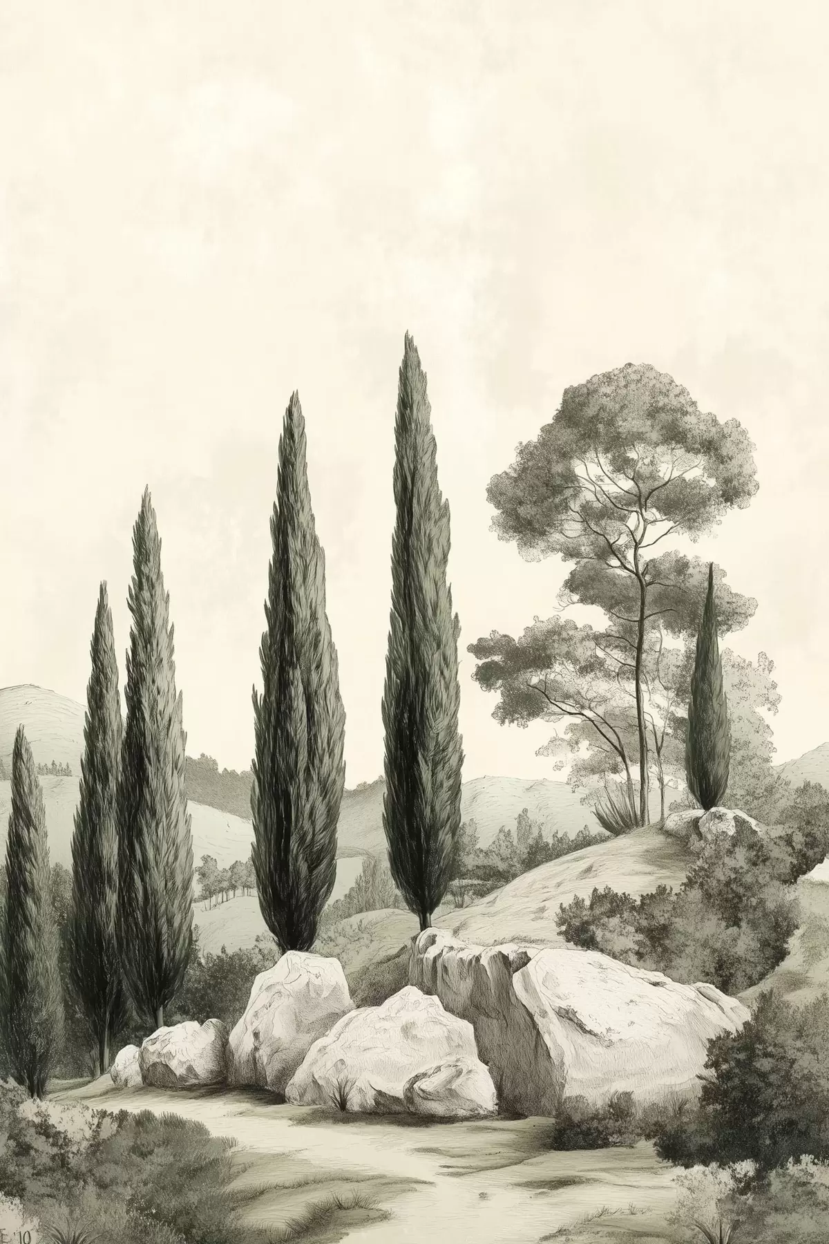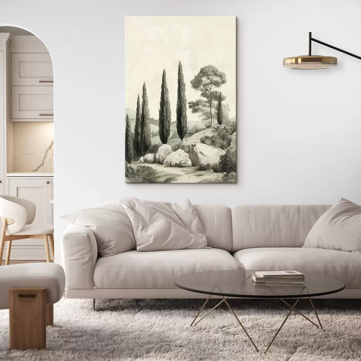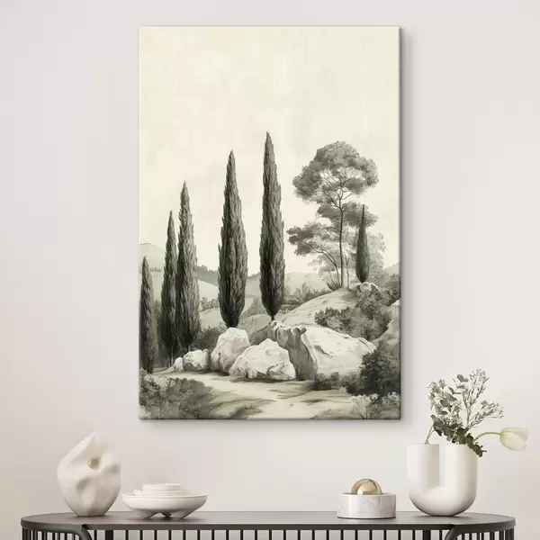 Obraz Toskánská krajina, pastelové barvy, cypřiše, skály, rustikální styl Č. s44307