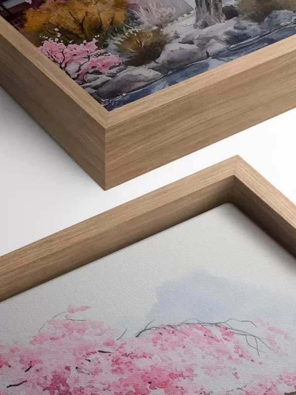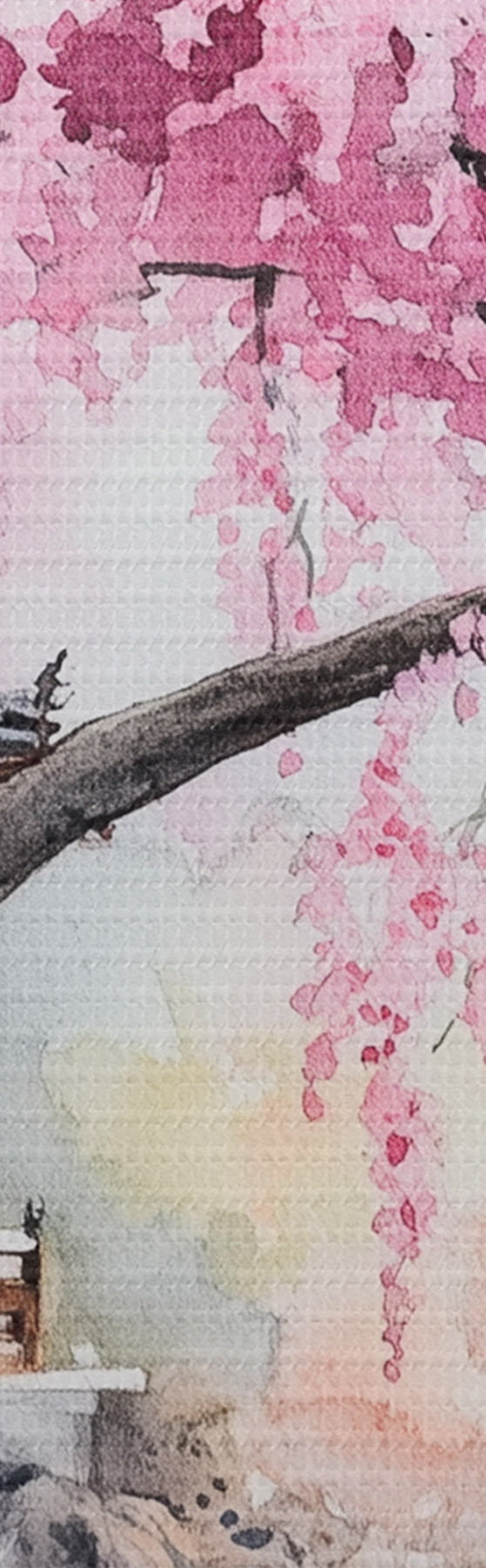 Obraz Růžový třešňový strom u domu na jezeře, Japonsko, orientální, akvarelový styl Č. s44312