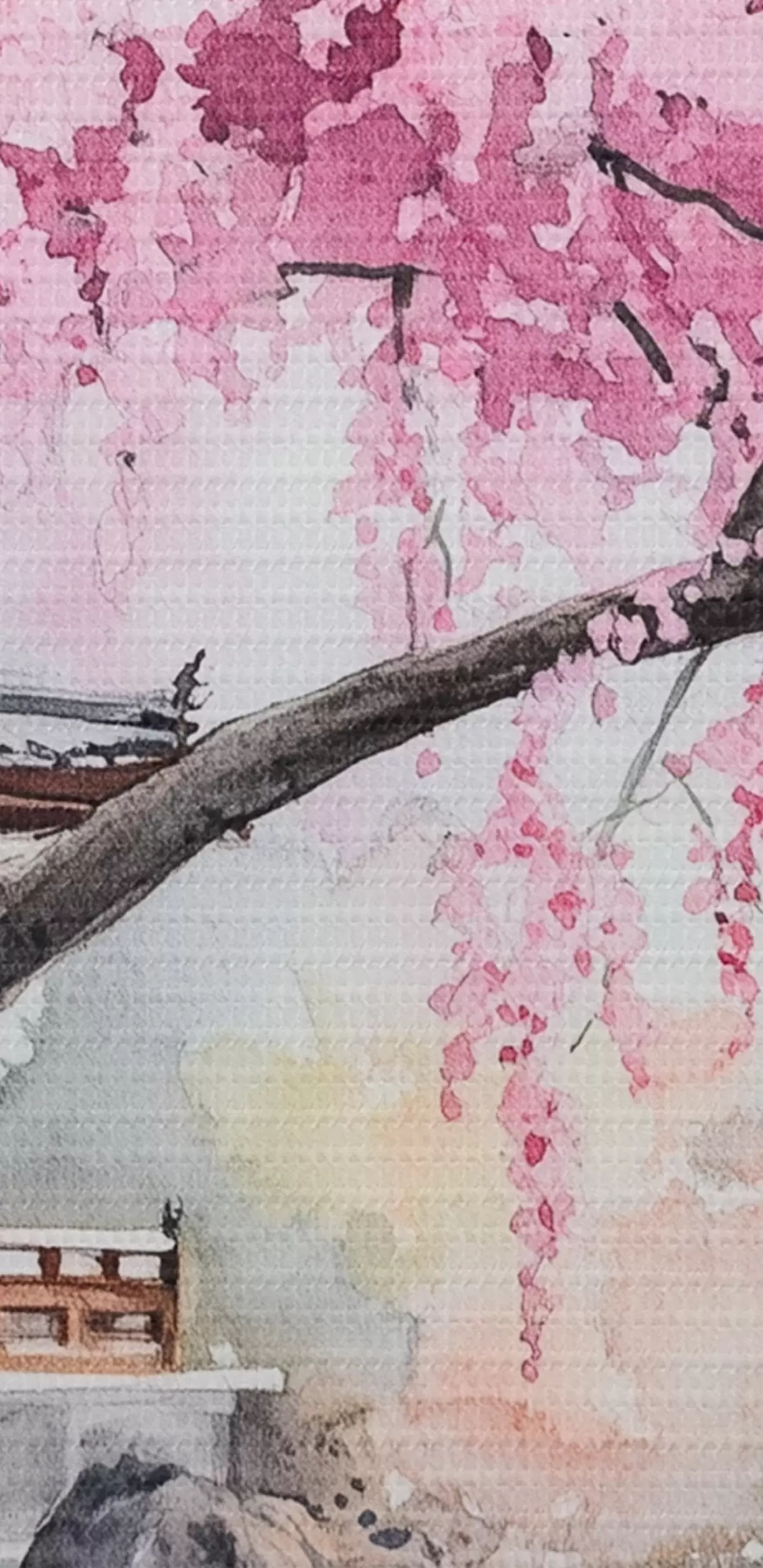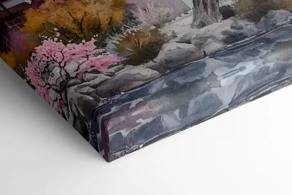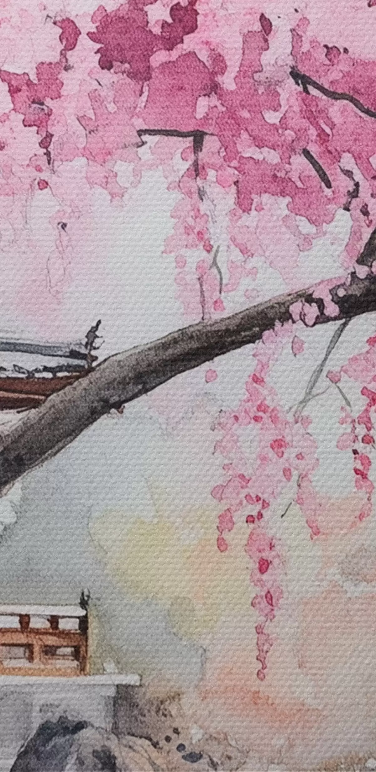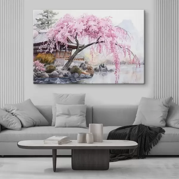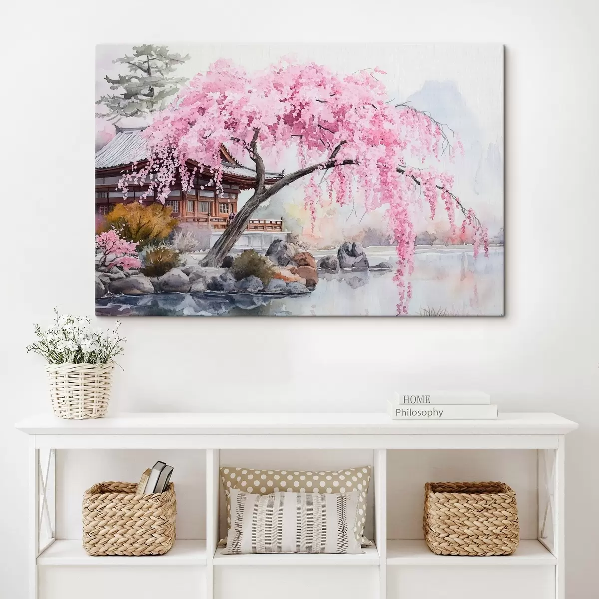 Obraz Růžový třešňový strom u domu na jezeře, Japonsko, orientální, akvarelový styl Č. s44312