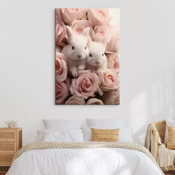 Obraz Dva bílí králíci v jemných květech růží Č. s44380