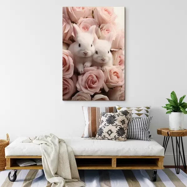 Obraz Dva bílí králíci v jemných květech růží Č. s44380