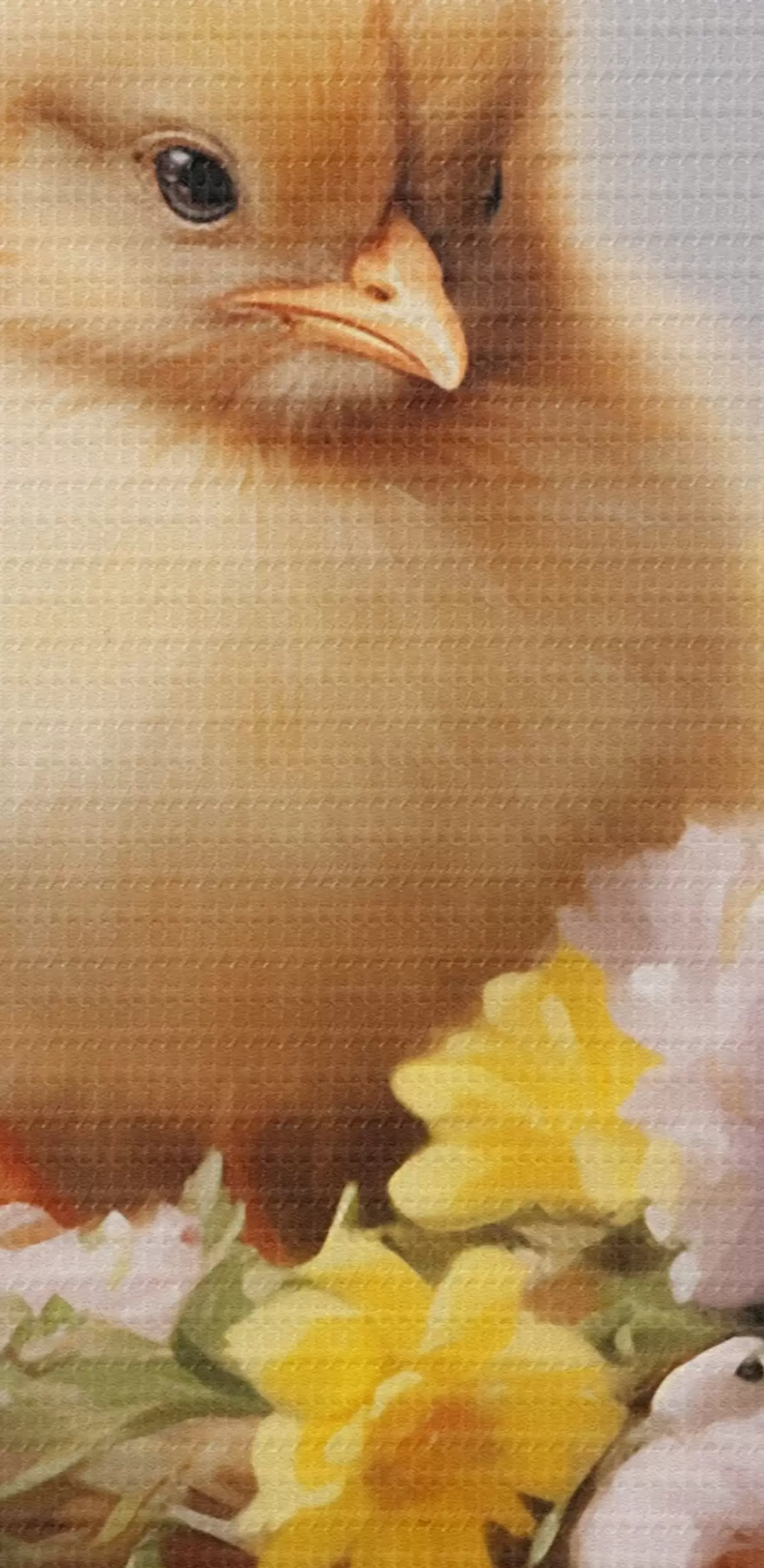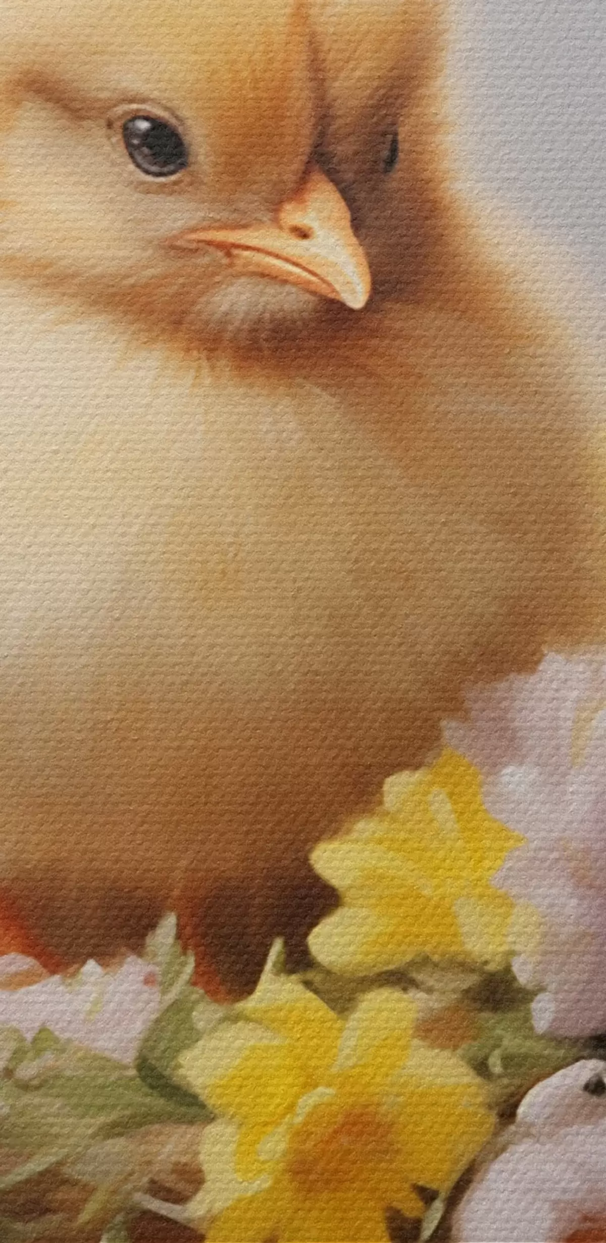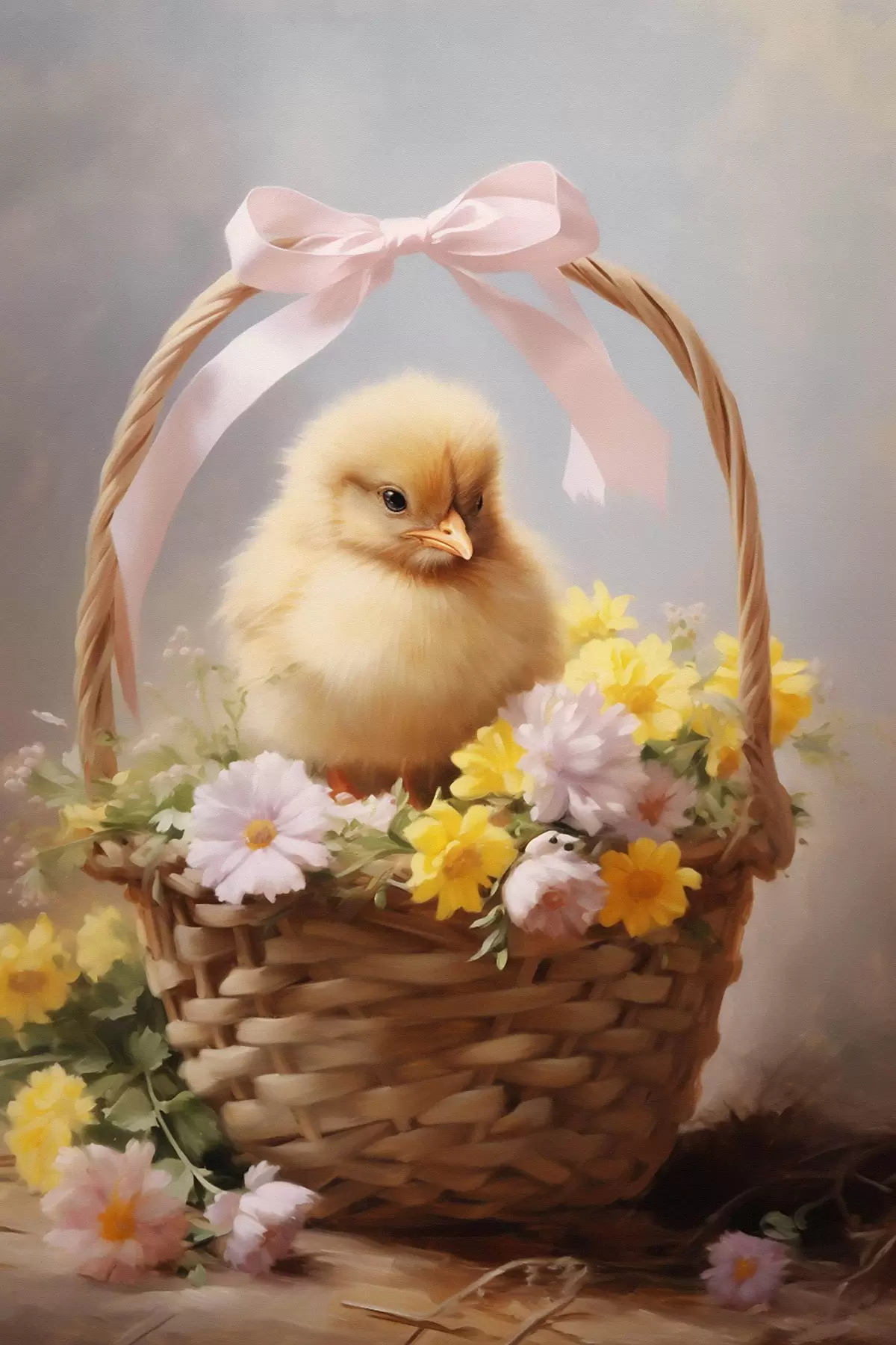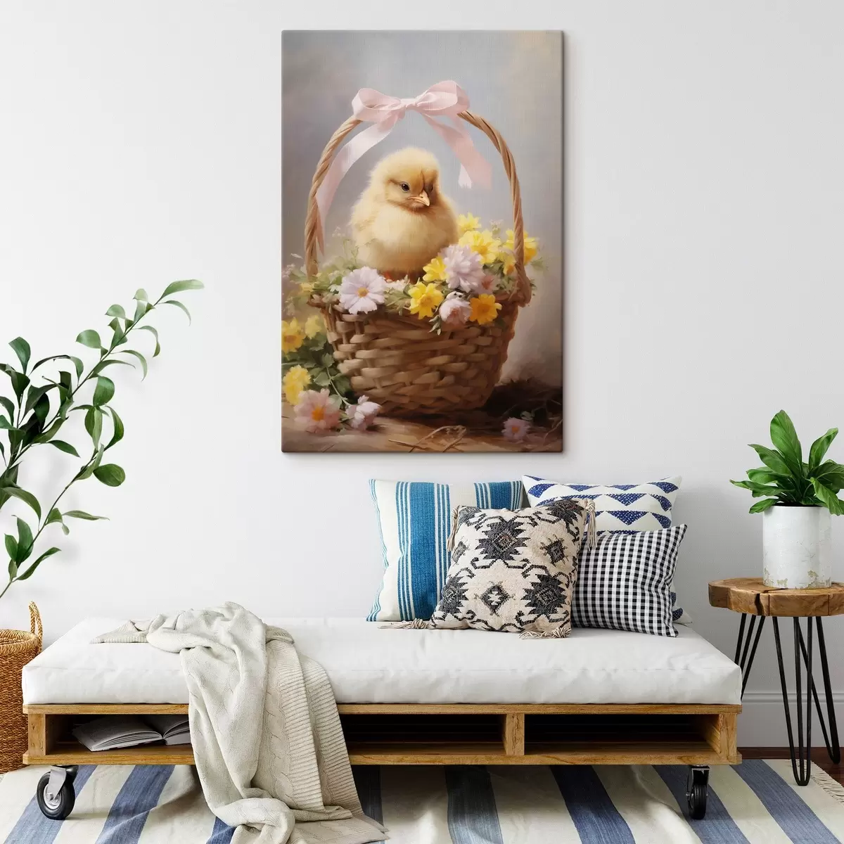 Obraz Žluté kuřátko v košíku s divokými květinami Č. s44384