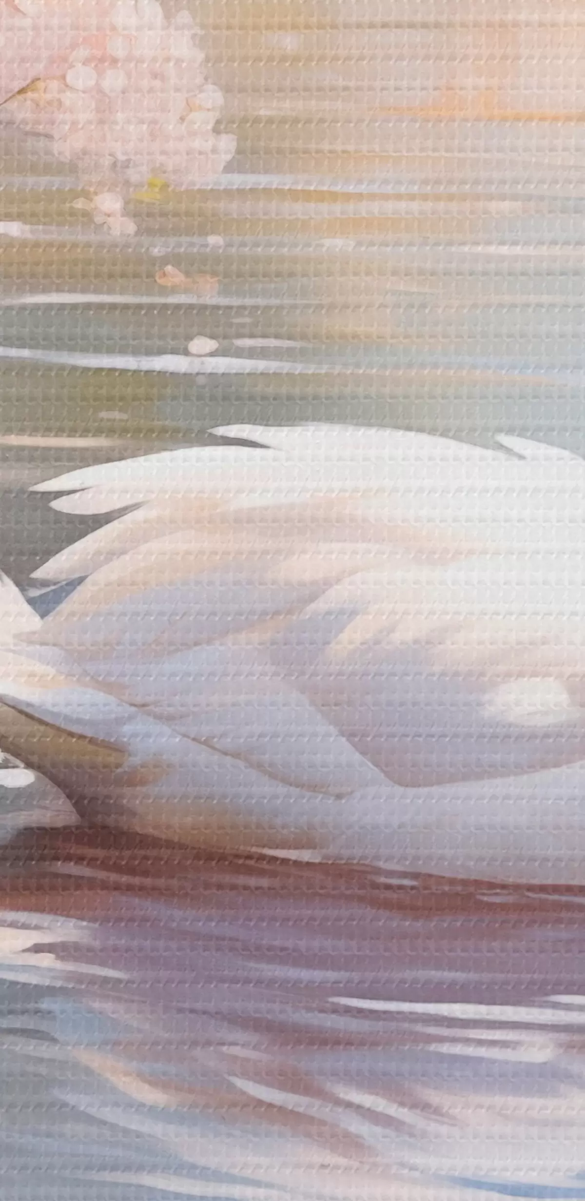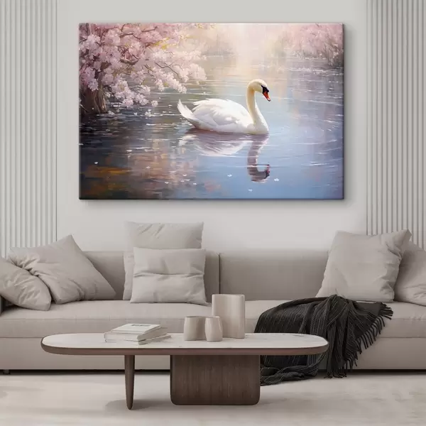 Obraz Bílá labuť plavající v jezeře s rozkvetlými třešněmi, pastelové barvy Č. s44396