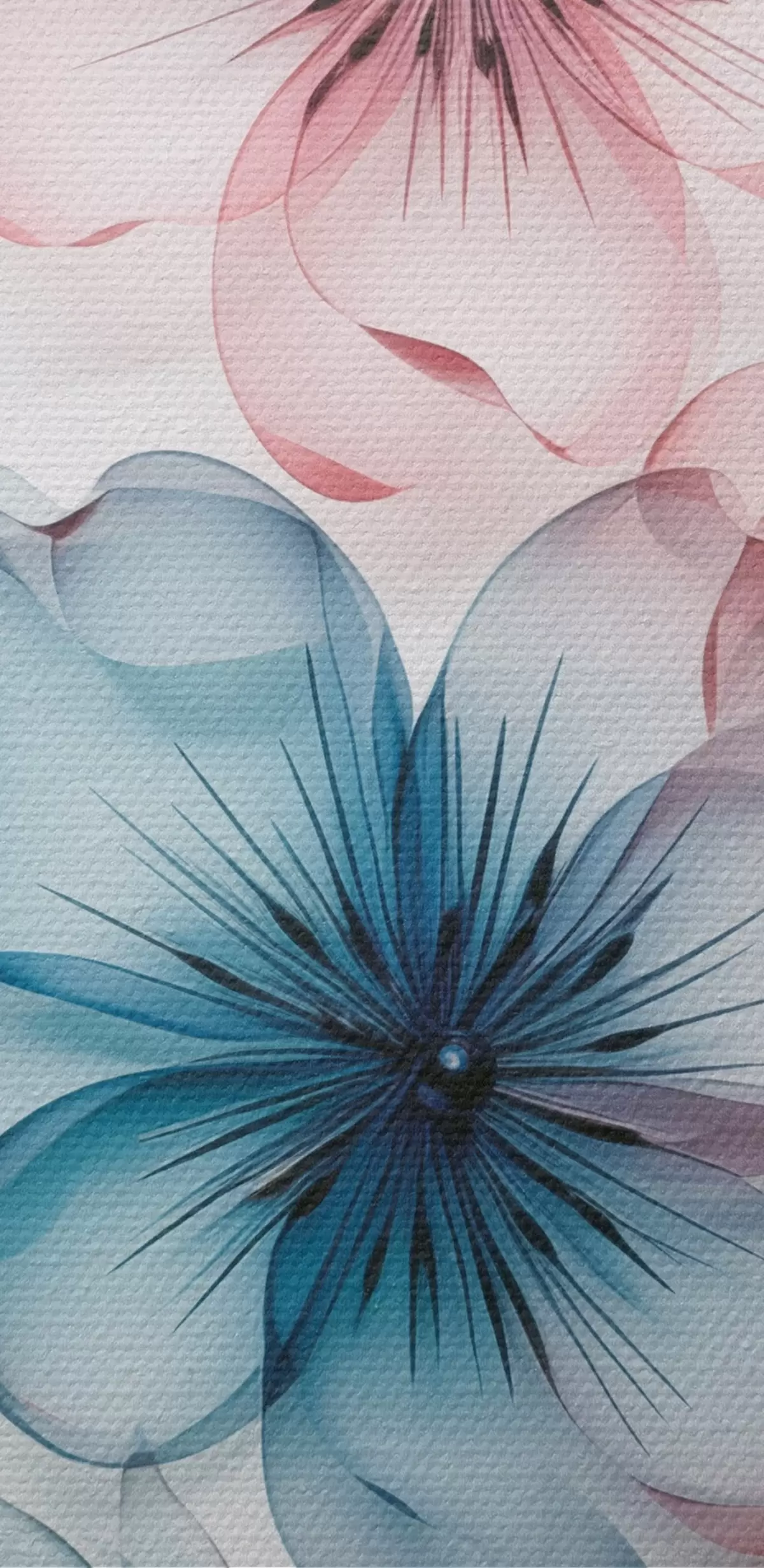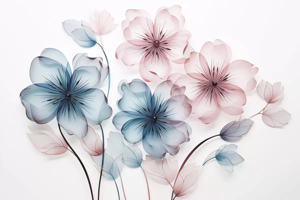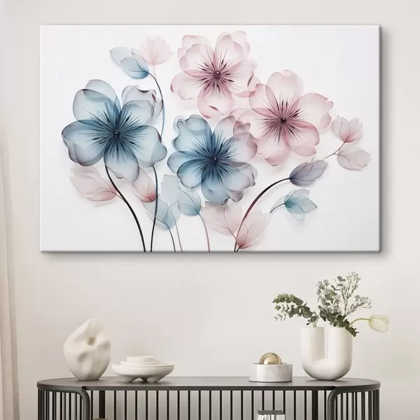 Obraz Průsvitné tlumené růžové a modré květy s viditelnými tyčinkami a stonky Č. s44405