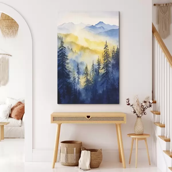 Obraz Mlhavé hory při východu slunce, borové lesy, modrá a žlutá barva Č. s44602