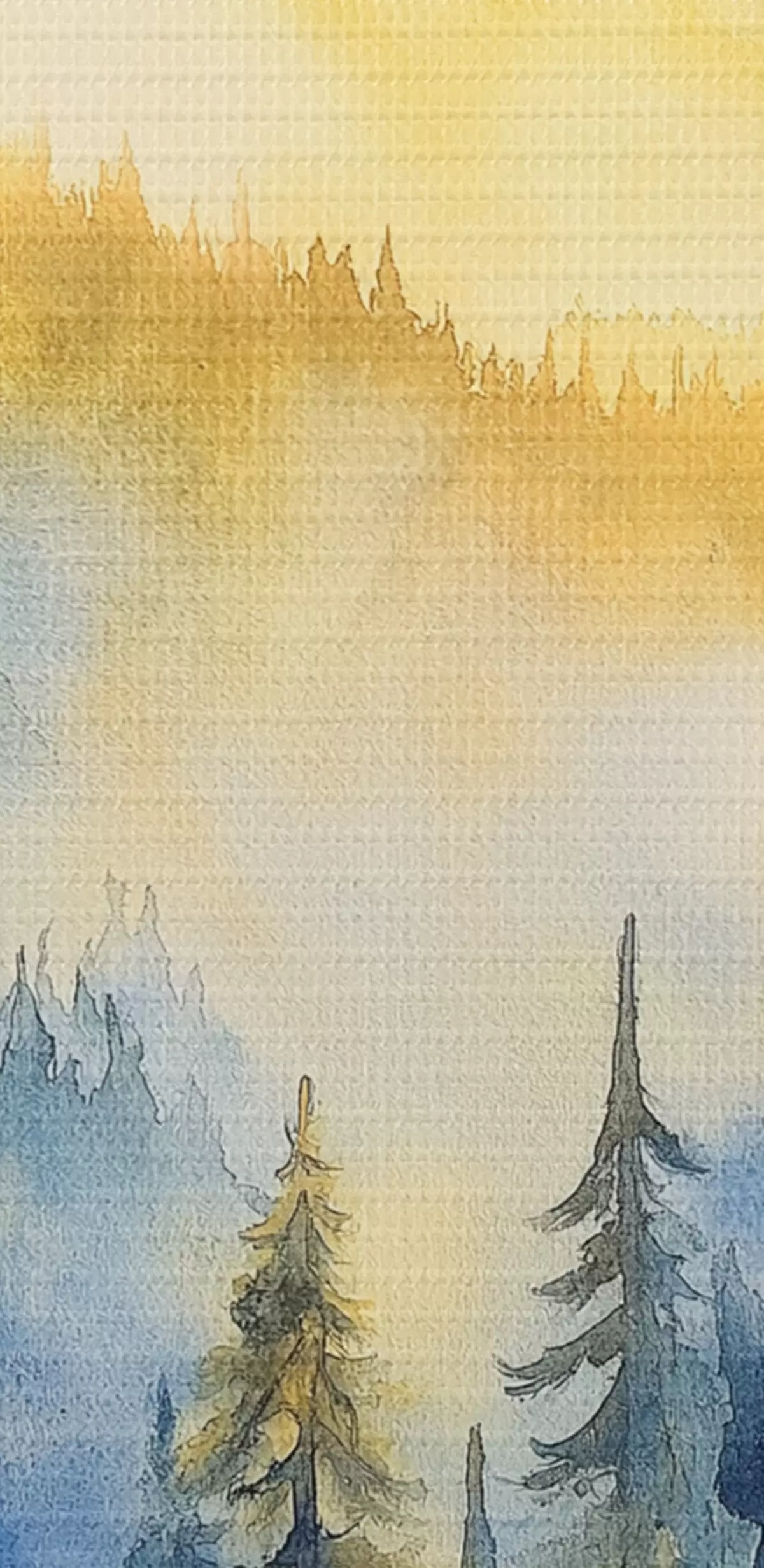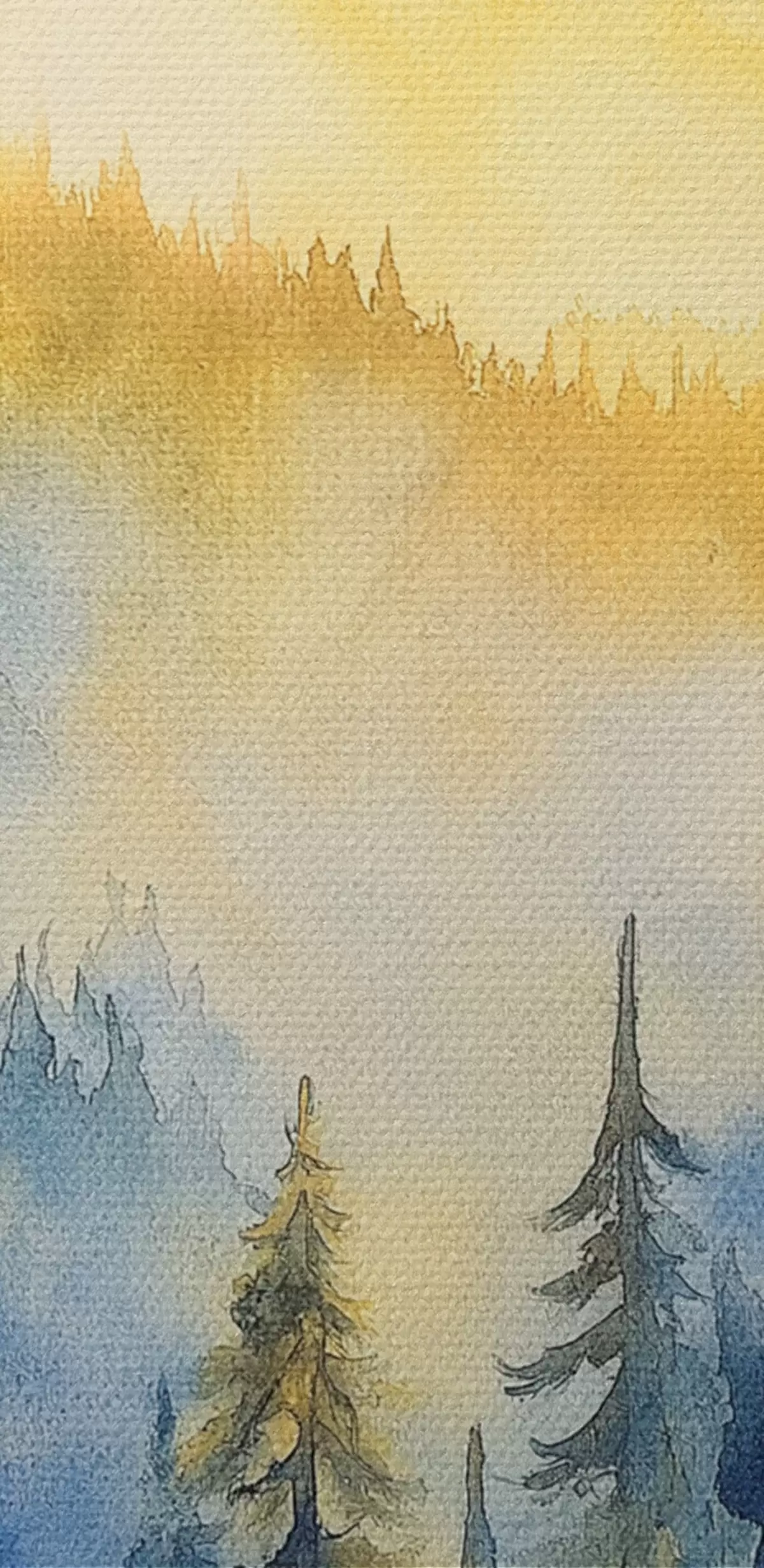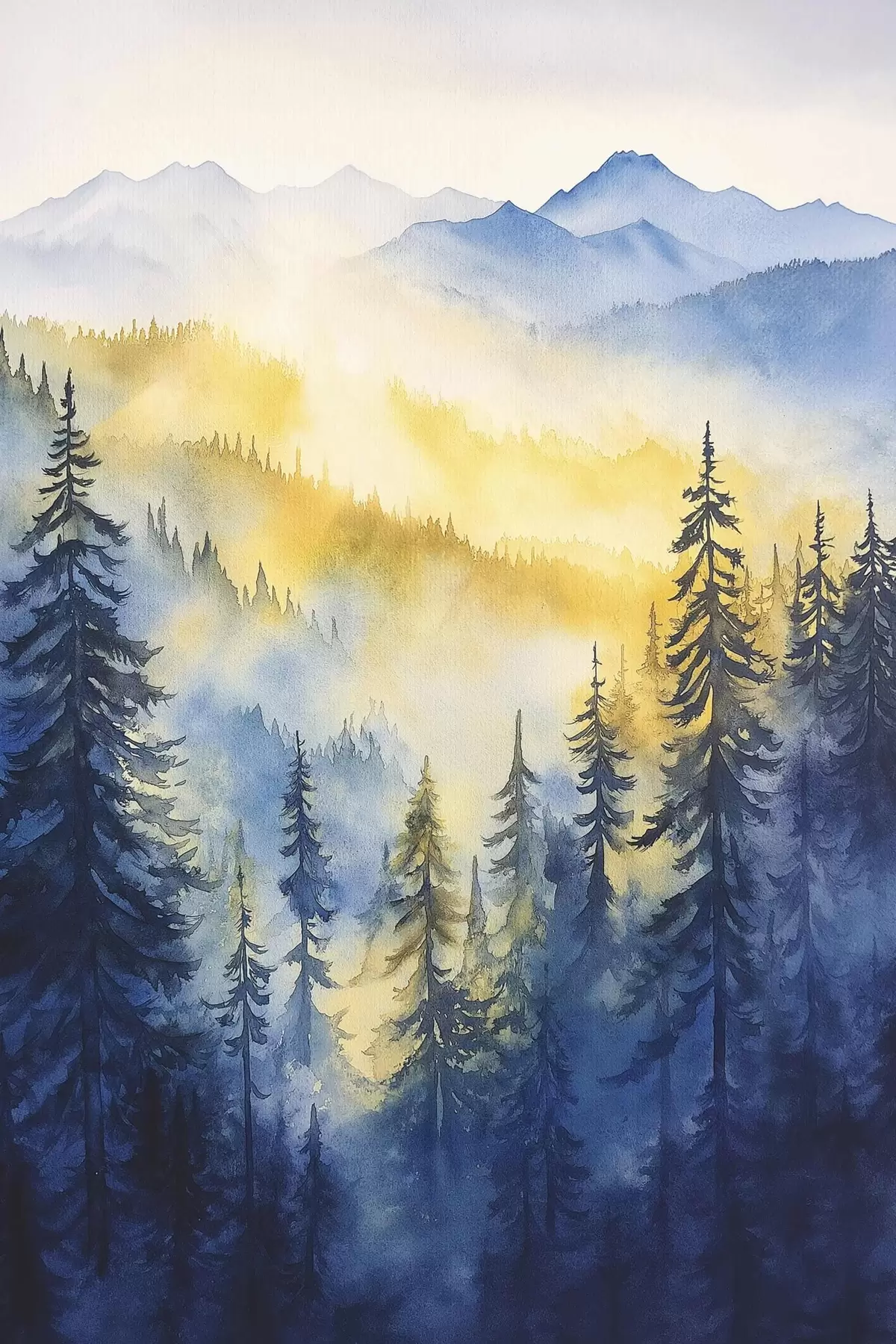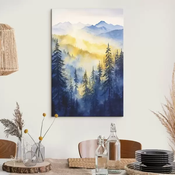 Obraz Mlhavé hory při východu slunce, borové lesy, modrá a žlutá barva Č. s44602