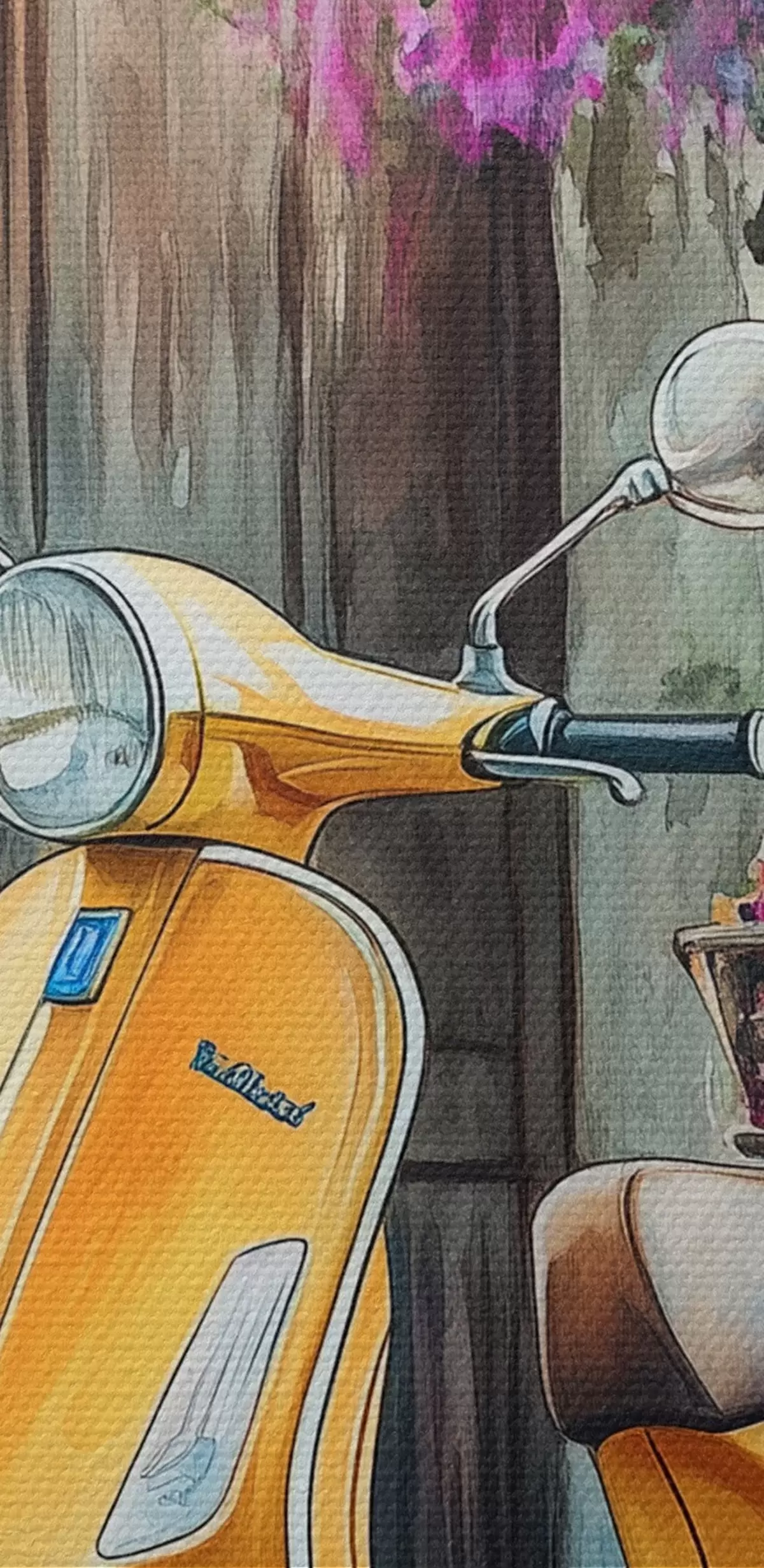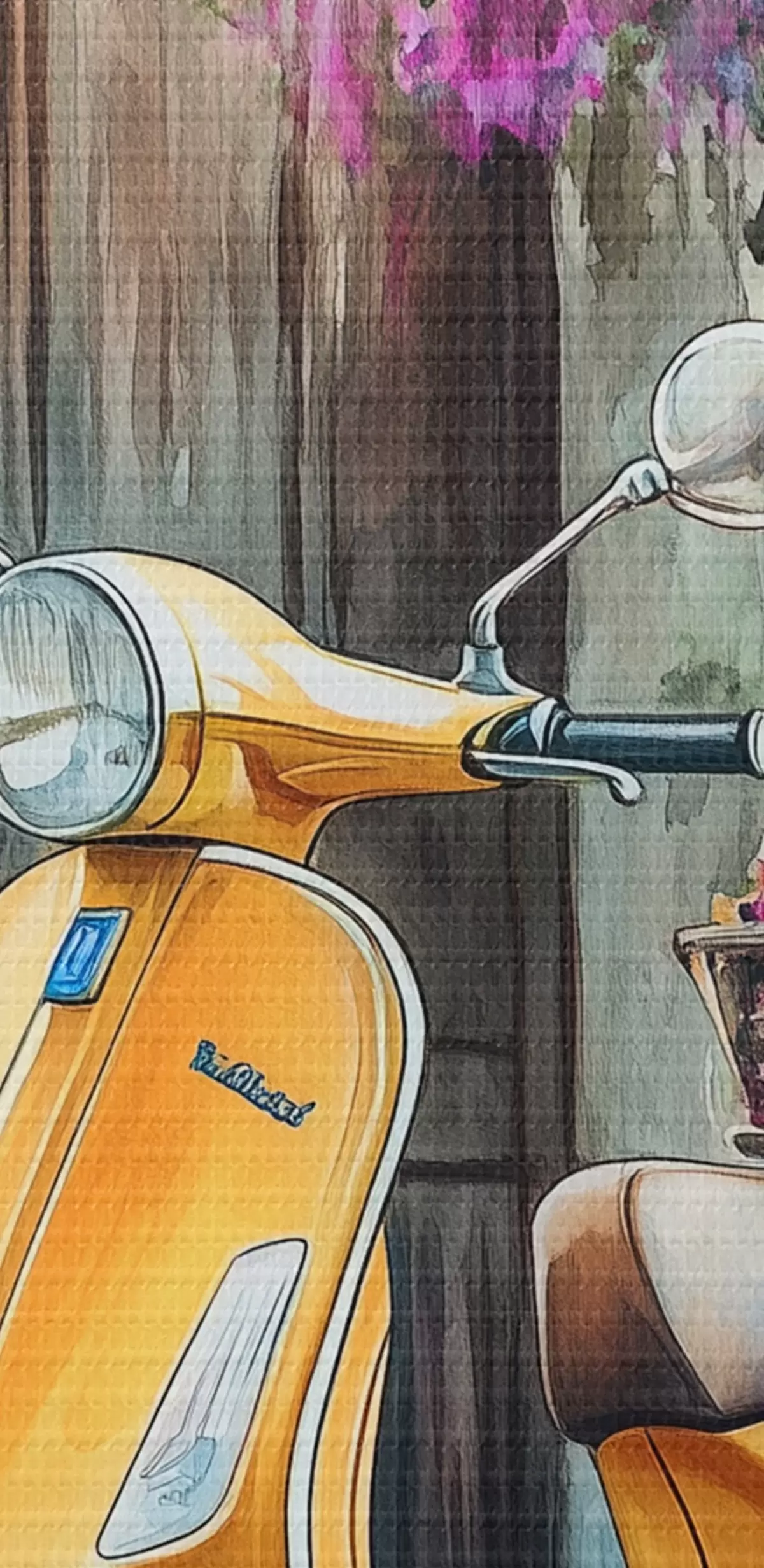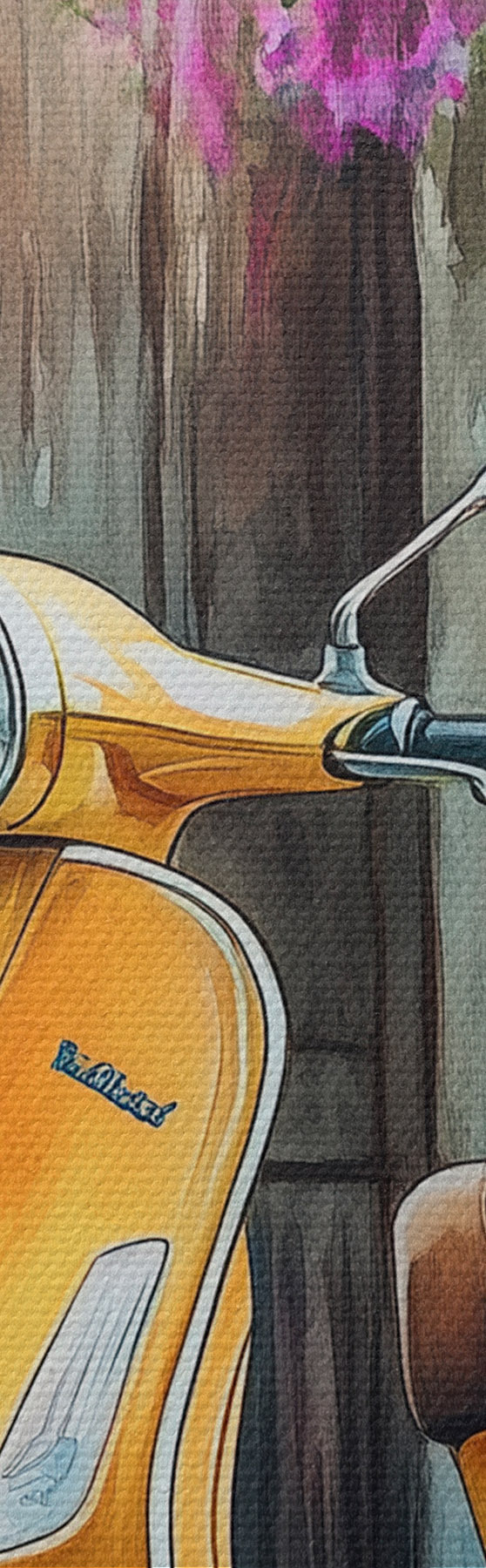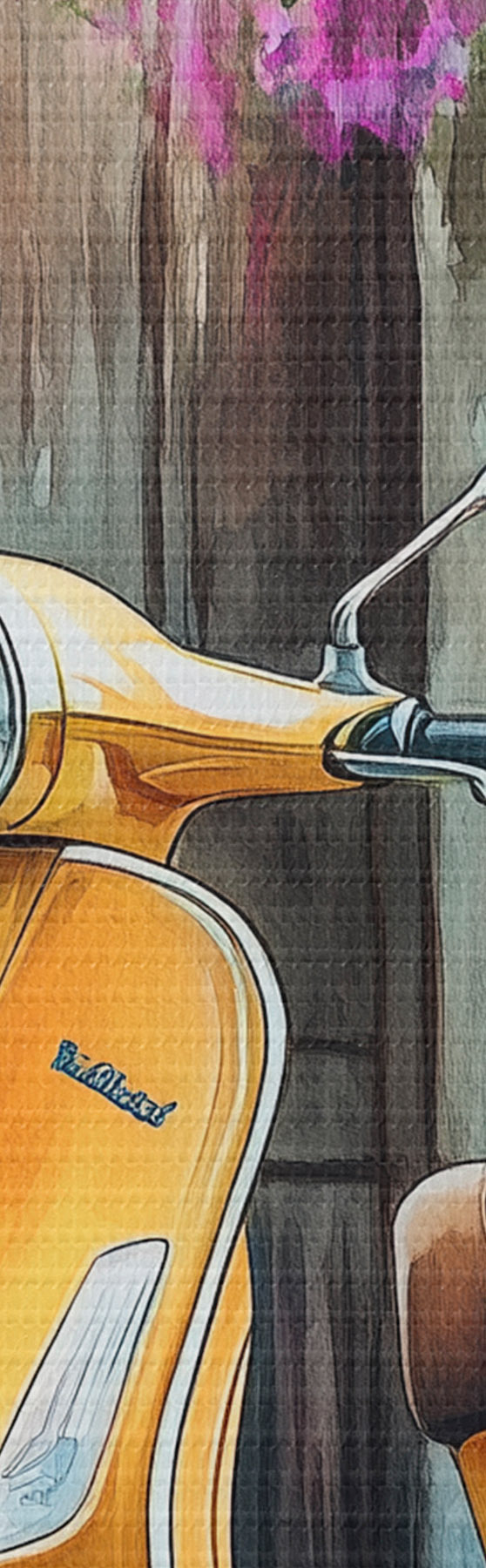 Obraz Žlutý skútr Vespa u dřevěných dveří s květinami Č. s44607