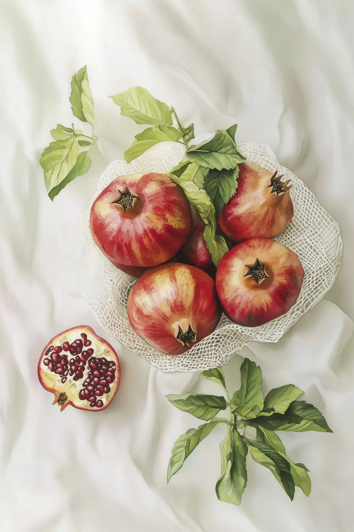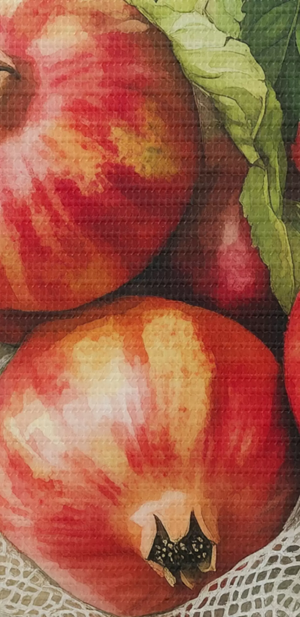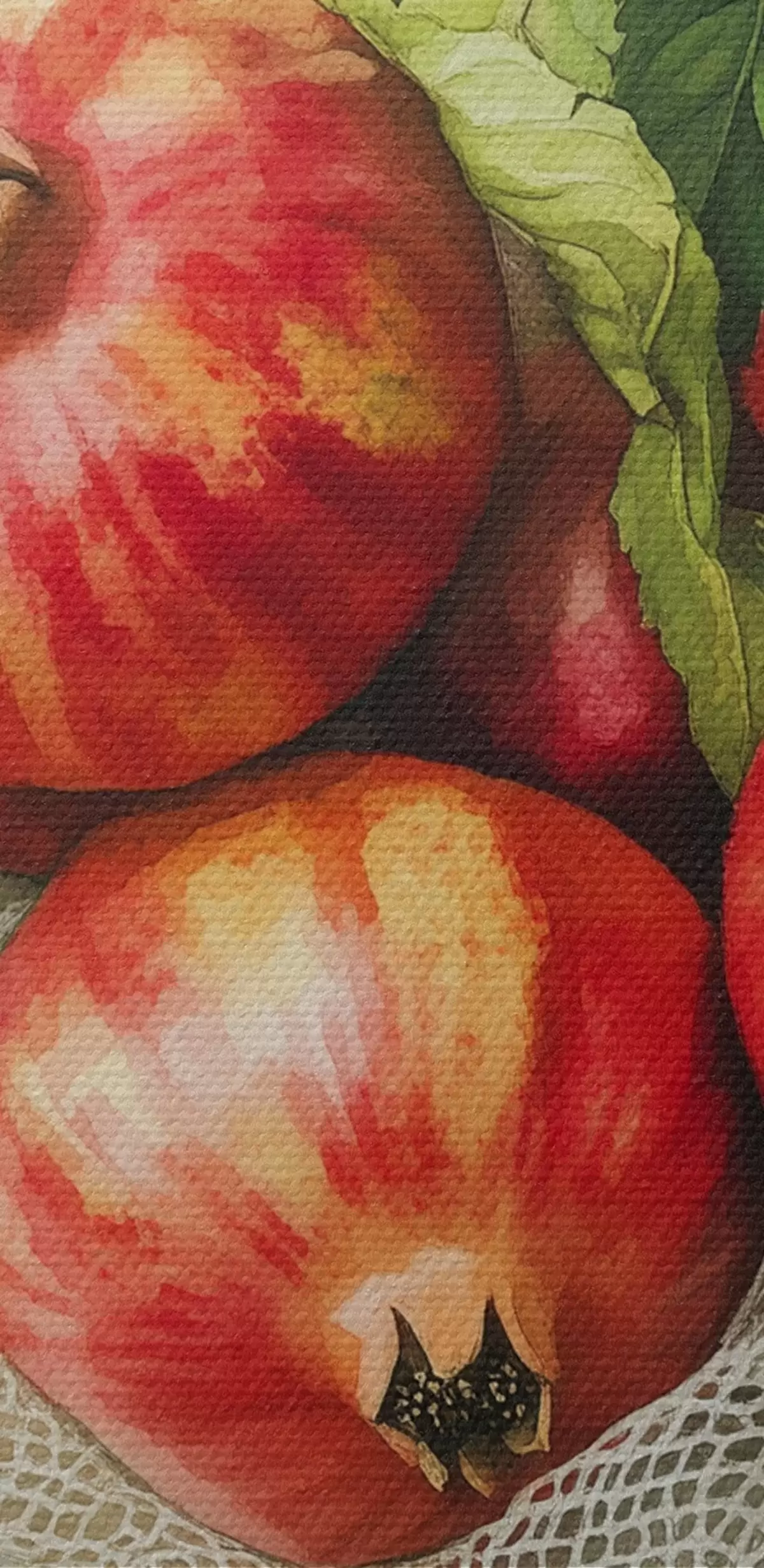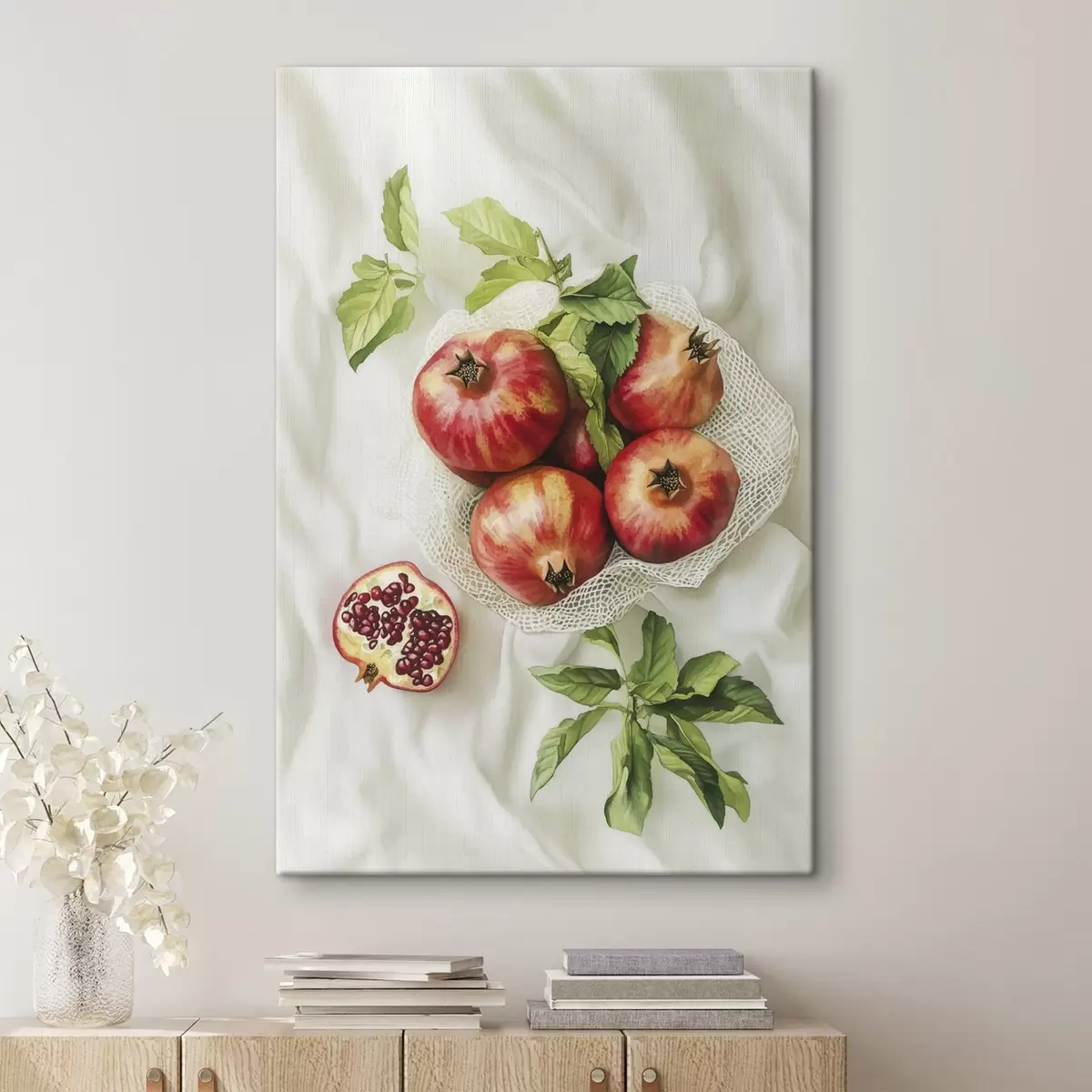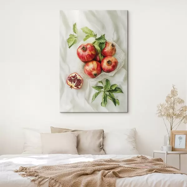 Obraz Granátová jablka s lístky máty na lněném ubrusu, rustikální styl Č. s44611