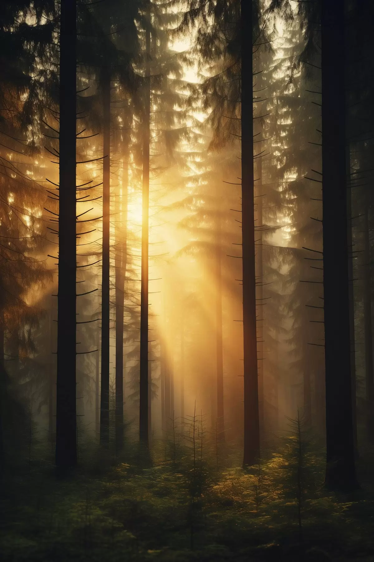 Obraz Hustý borový les se západem slunce, realismus, příroda Č. s44615