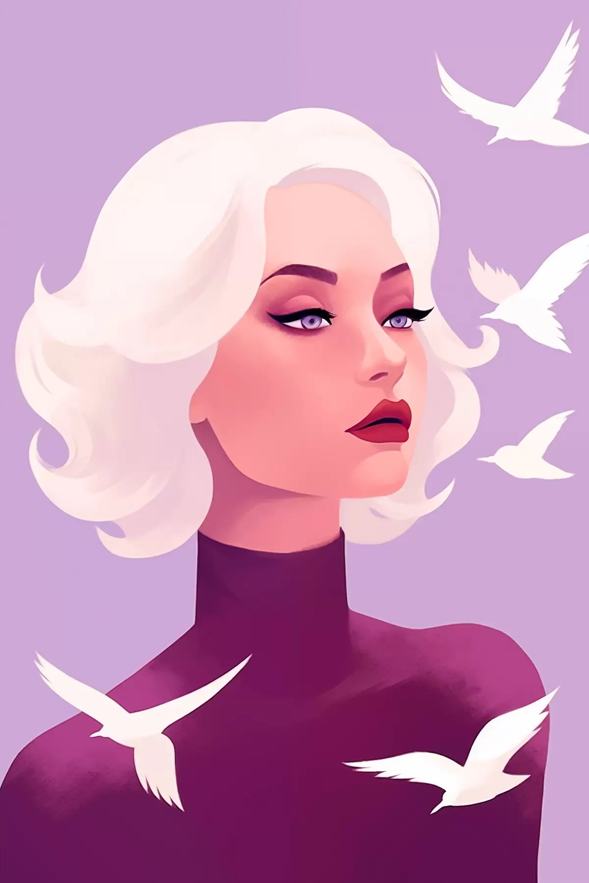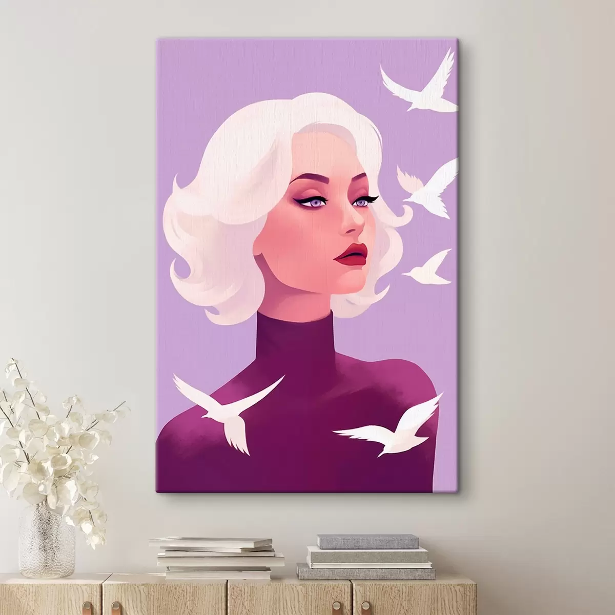 Obraz Ženský portrét s bílými vlasy na pozadí s ptáky Č. s44681