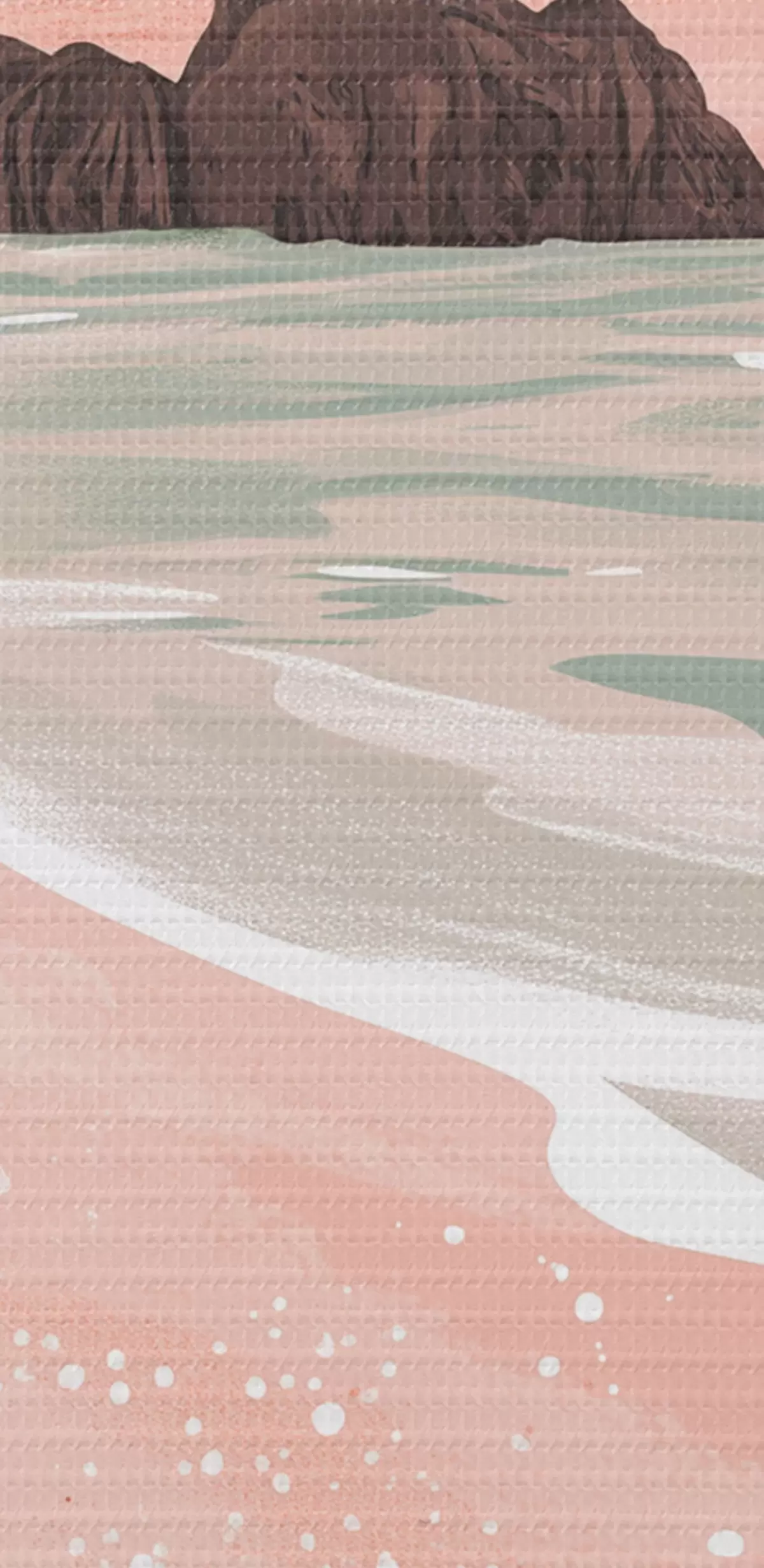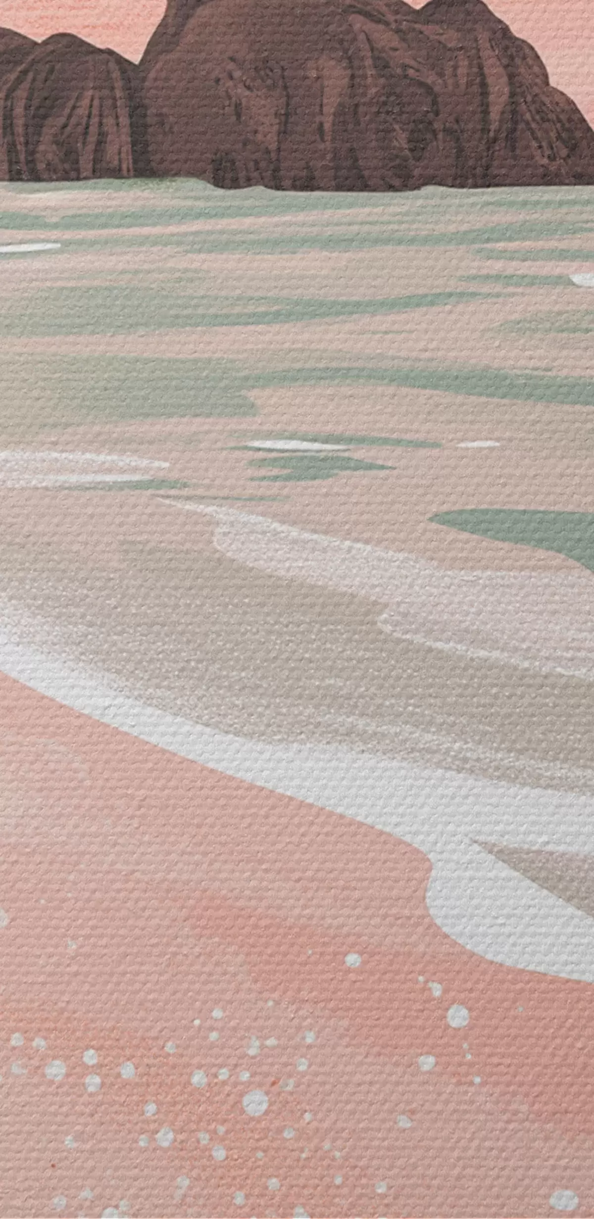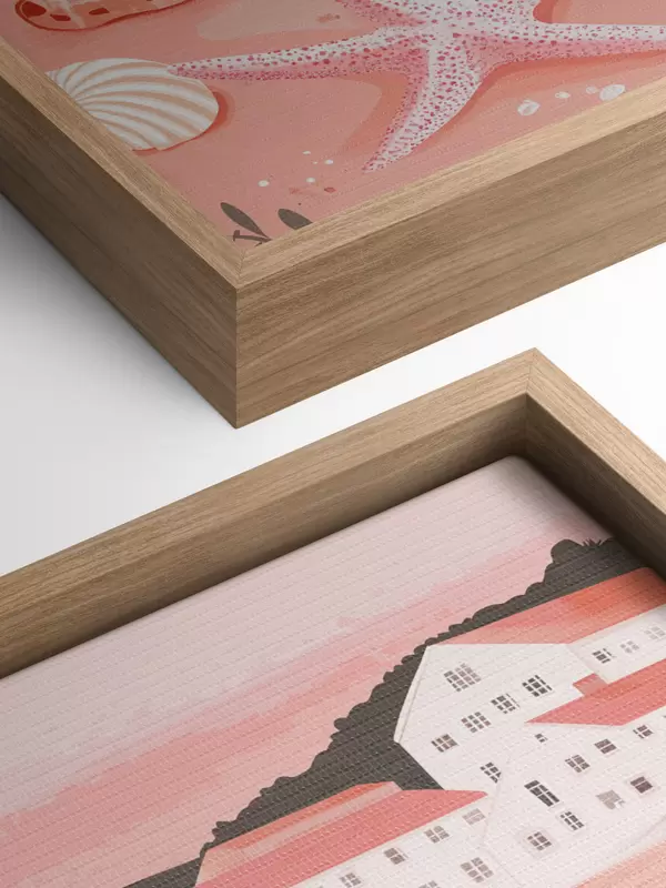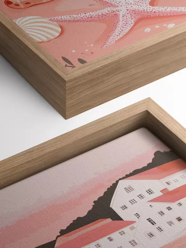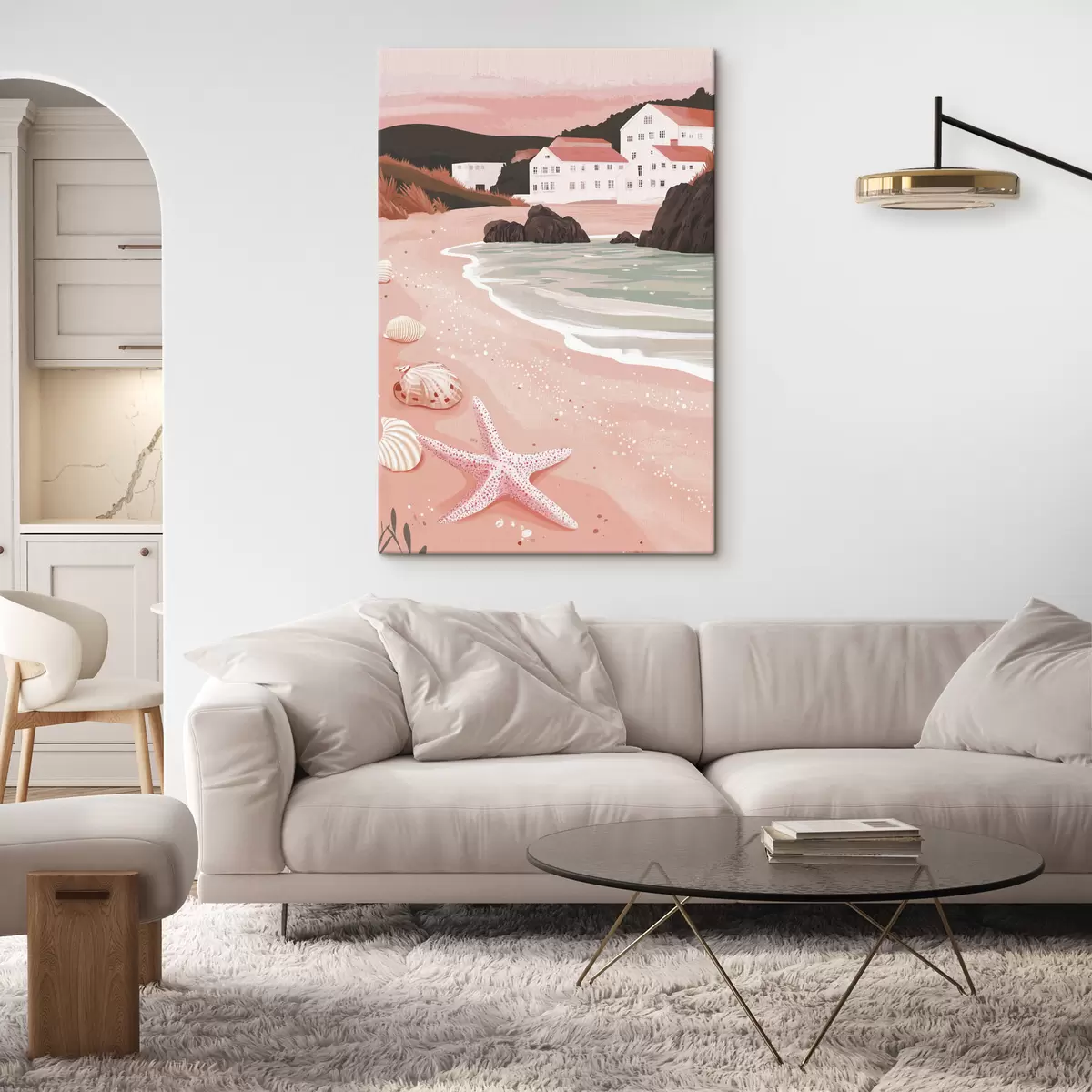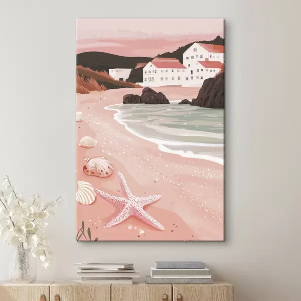 Obraz Útulná růžová pláž s bílými domky a mušlemi Č. s44713