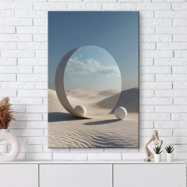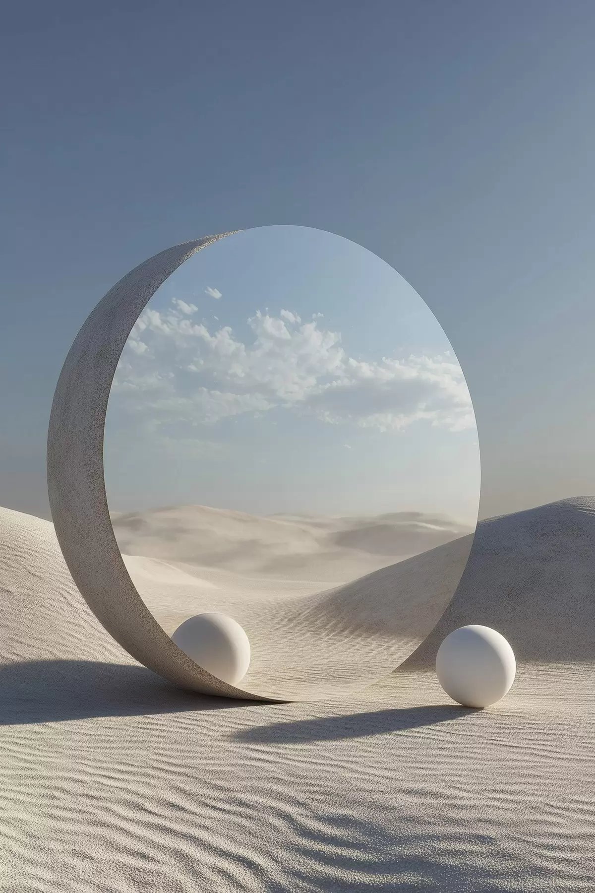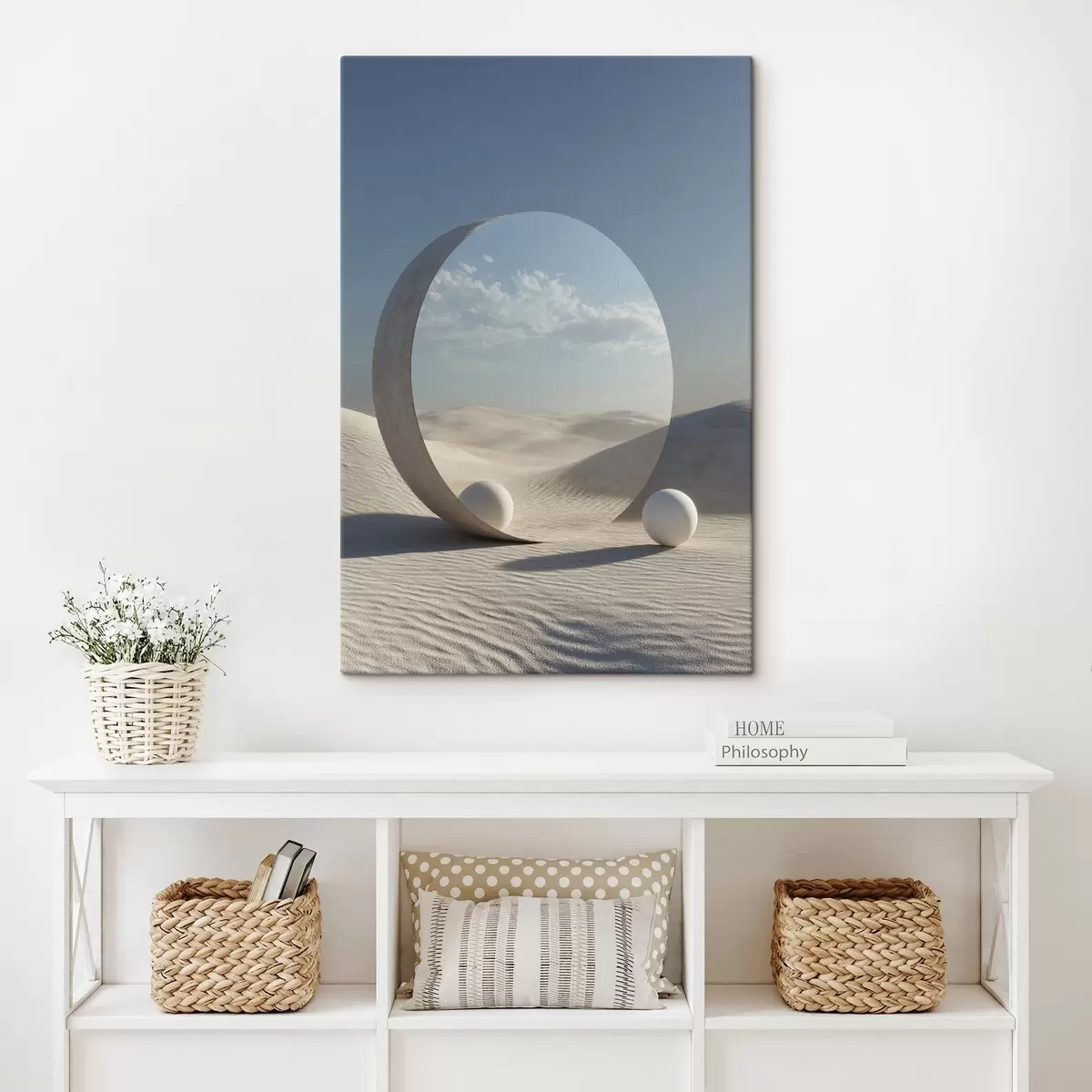 Obraz Surrealistická pouštní krajina s kulatým zrcadlem odrážejícím oblohu a měsíc Č. s44792