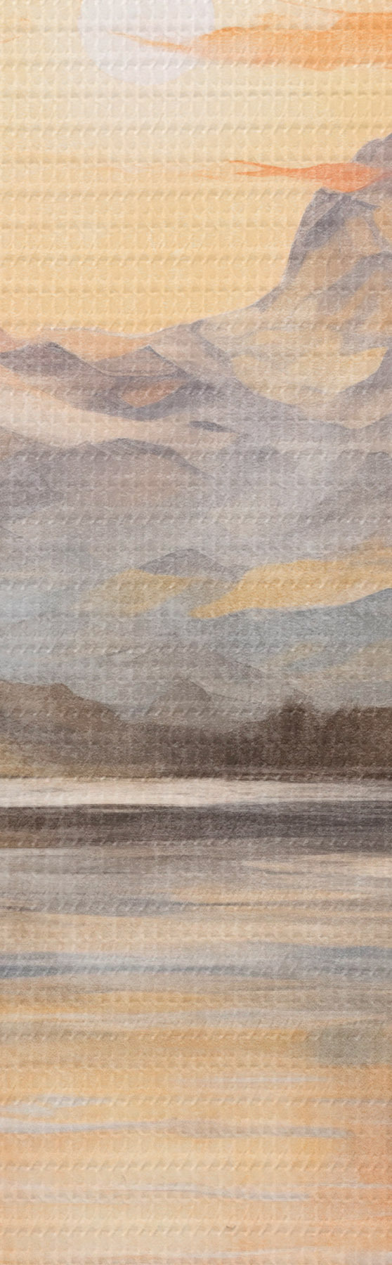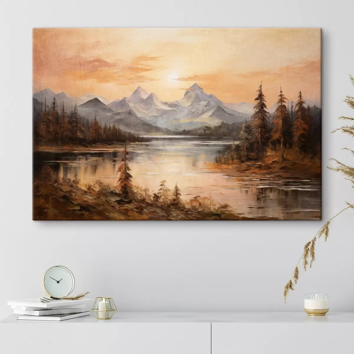 Obraz Krajina s jezerem obklopeným stromy a horami v pozadí, oranžová obloha se sluncem Č. s44857
