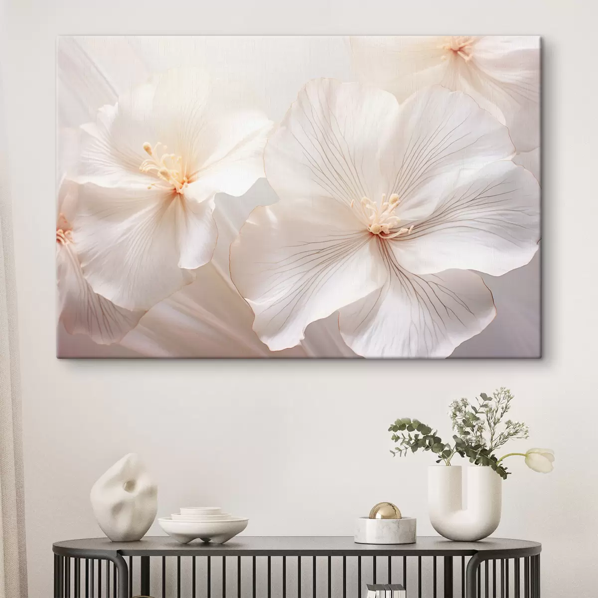 Obraz Jemné bílé květy s okvětními lístky a jemnými pastelovými středy vytvářejí zasněné a éterické květinové umění Č. s44858