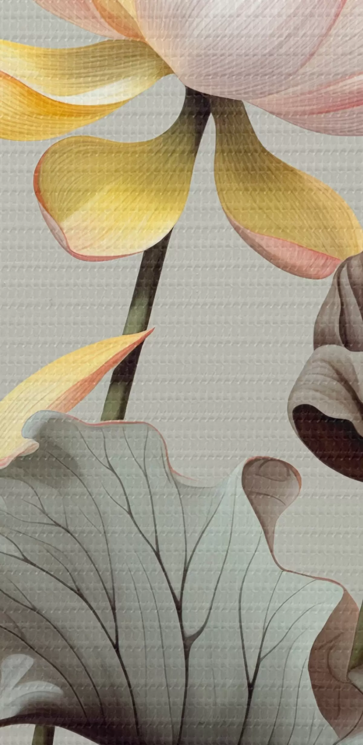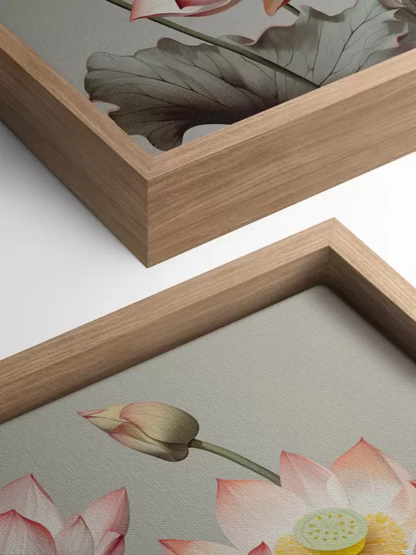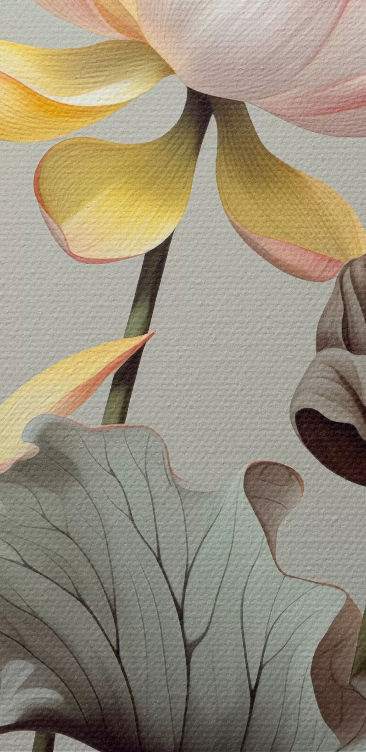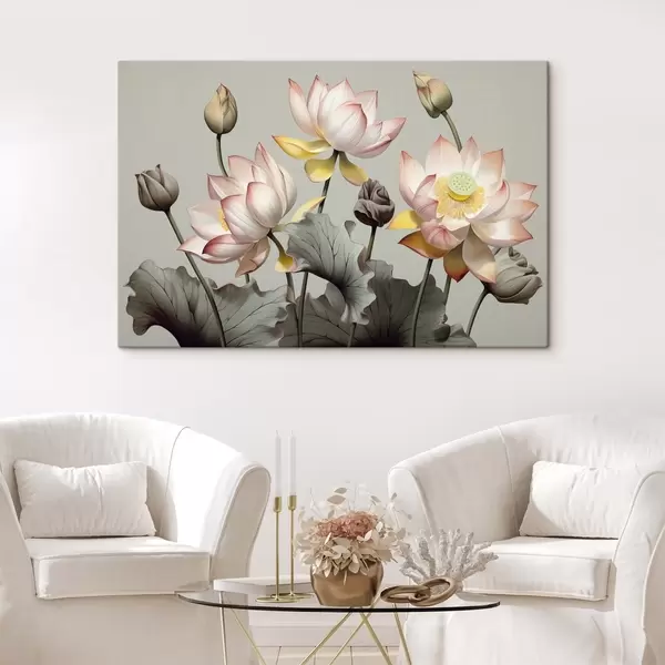 Obraz Lotosové květy s pastelovými okvětními lístky a zelenými listy v tlumené barevné paletě na hladkém pozadí Č. s44862