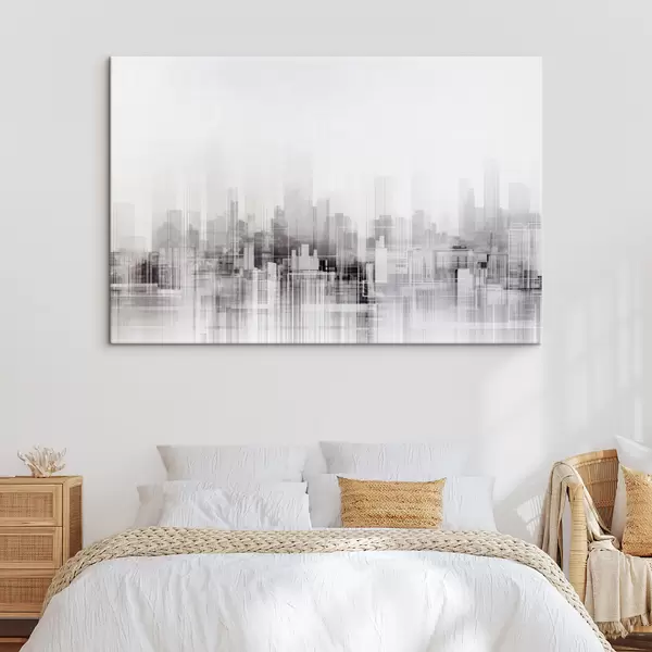 Obraz Texturovaná minimalistická městská krajina s vysokými budovami a mrakodrapy v siluetě na bílé obloze Č. s44863
