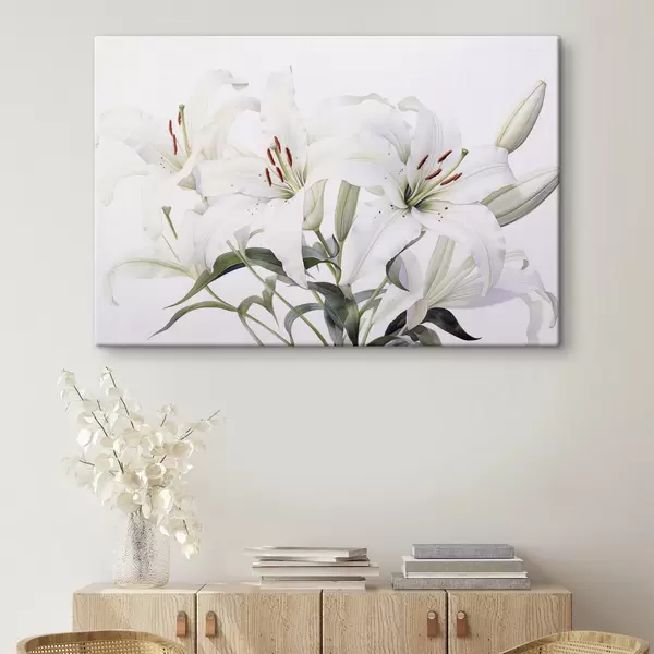 Obraz Kytice bílých lilií se zelenými listy, jemnými okvětními lístky a jemným bílým pozadím Č. s44868