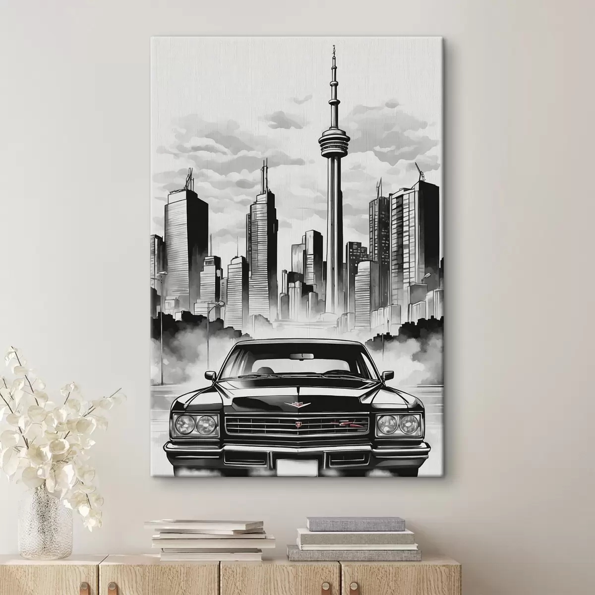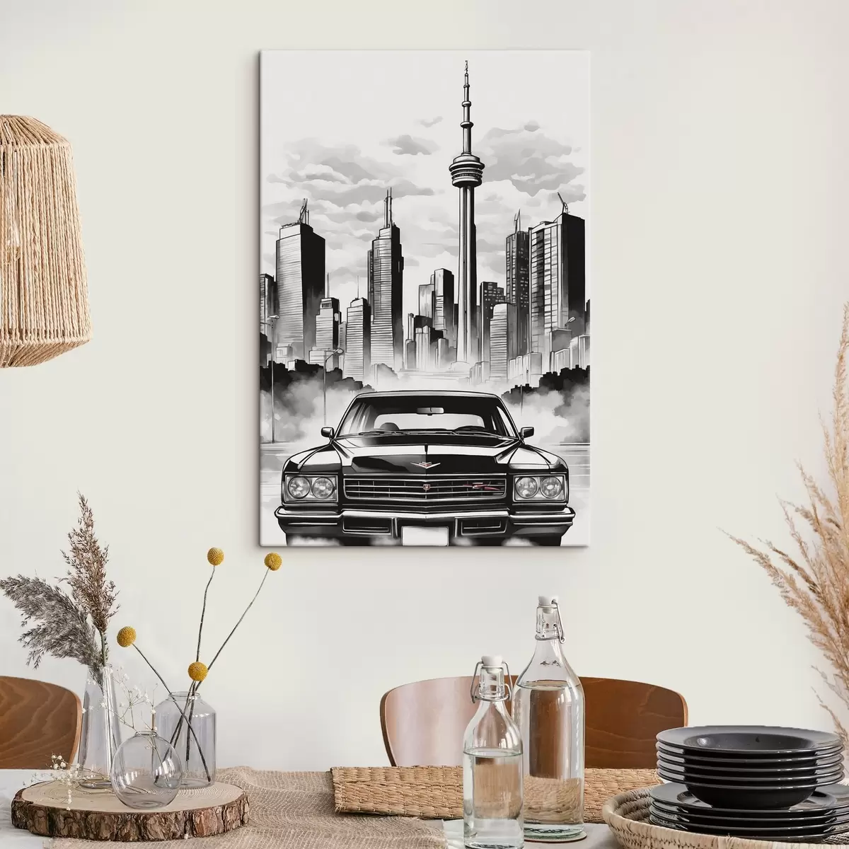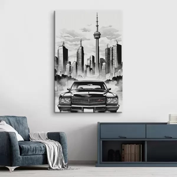 Obraz Retro auto na pozadí černobílého města s mrakodrapy Č. s44871