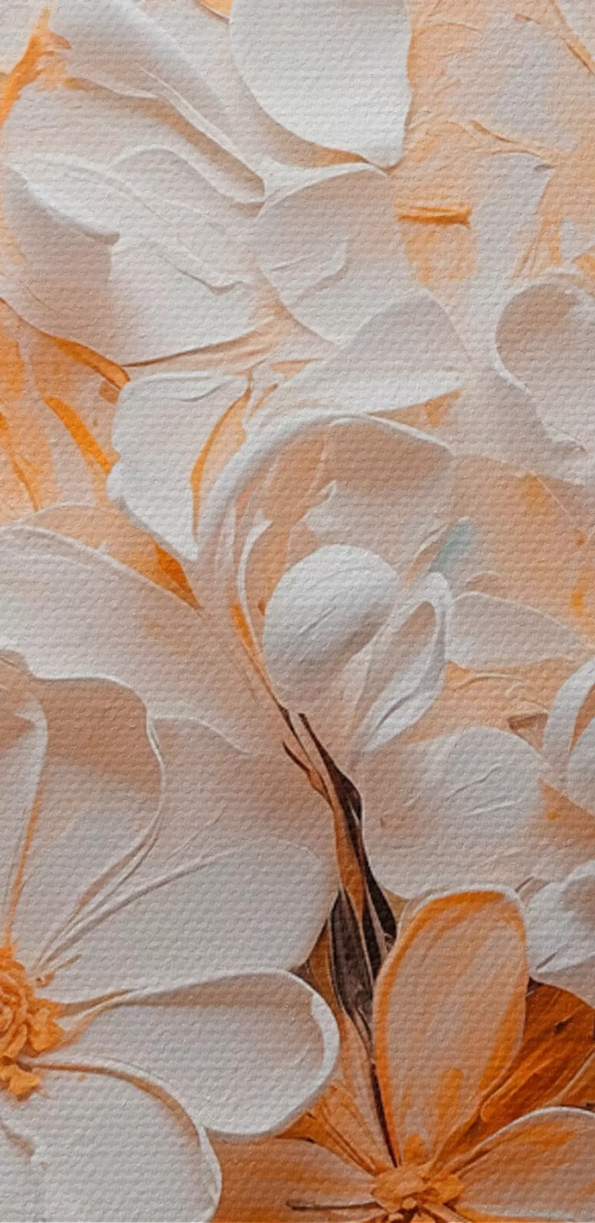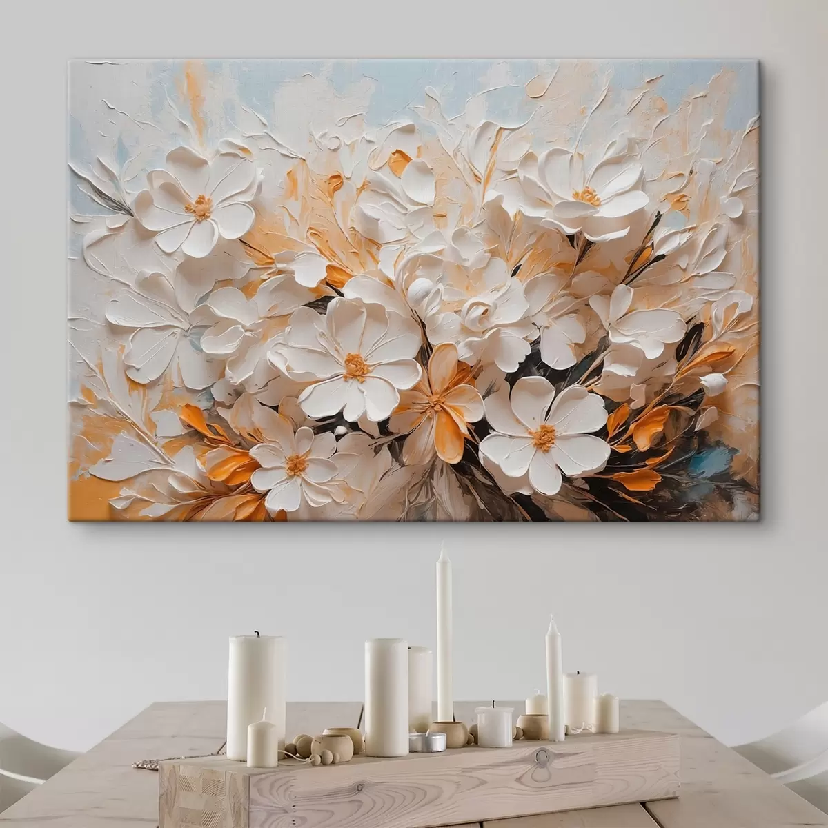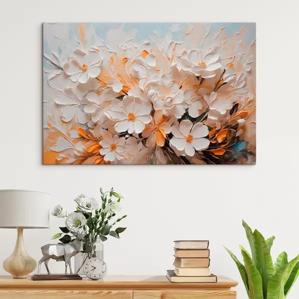 Obraz Bílé a broskvové květy na modrém pozadí s pastelovými barvami Č. s44879
