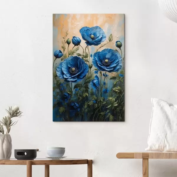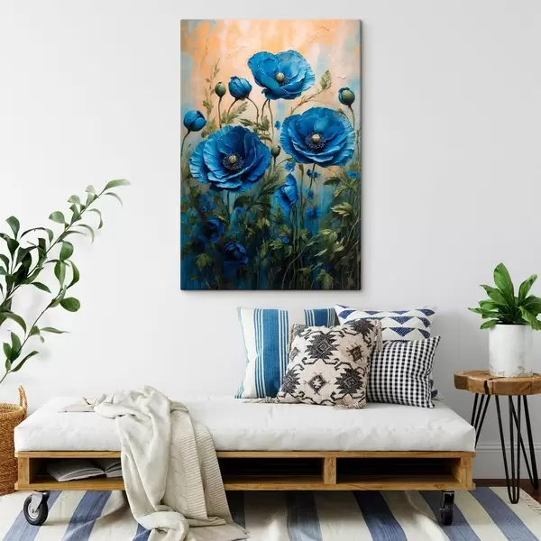 Obraz Modré vlčí máky na pastelovém pozadí s listy Č. s44882