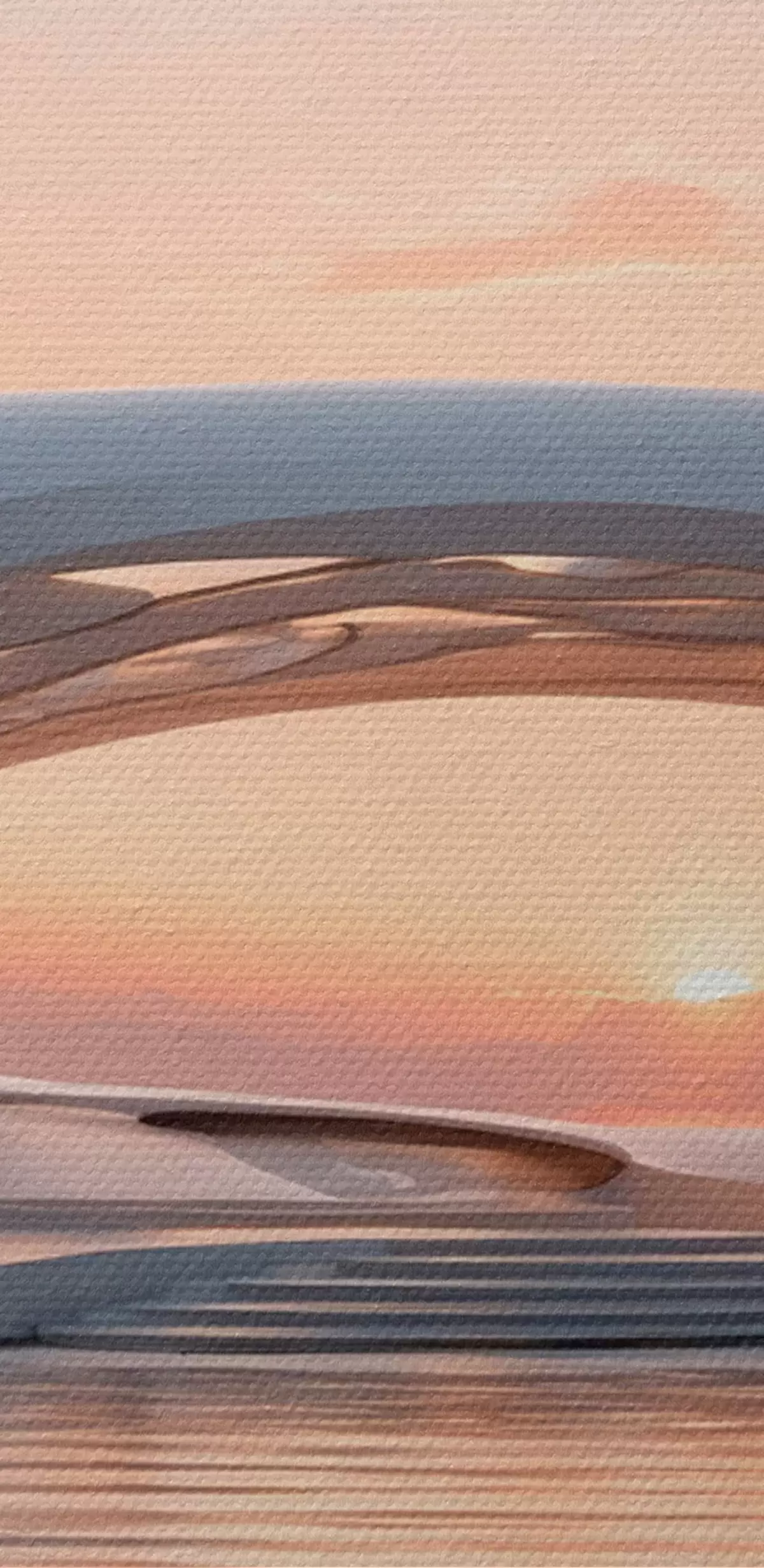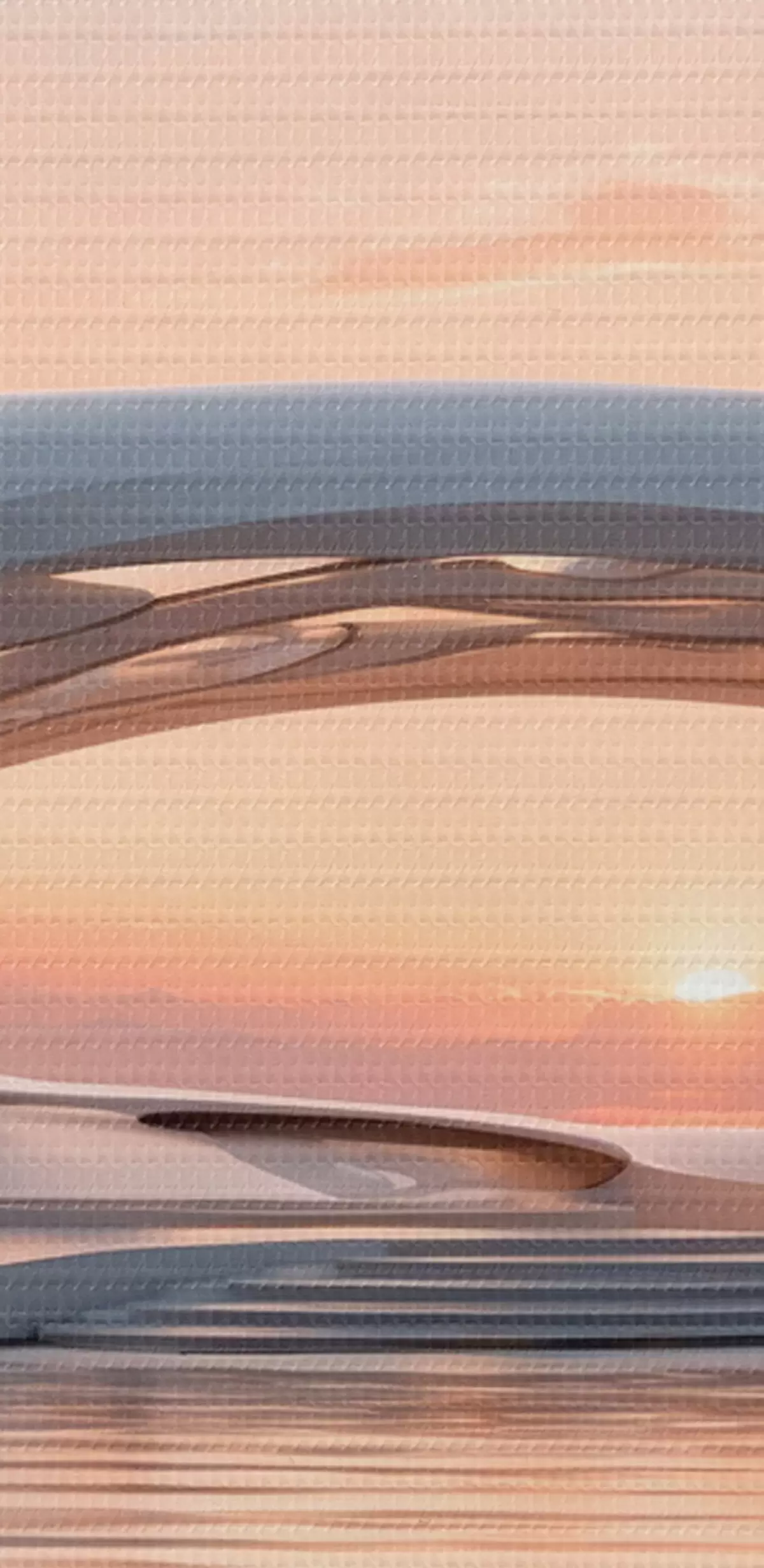 Obraz Futuristická budova na vodě na pozadí růžového západu slunce Č. s44884