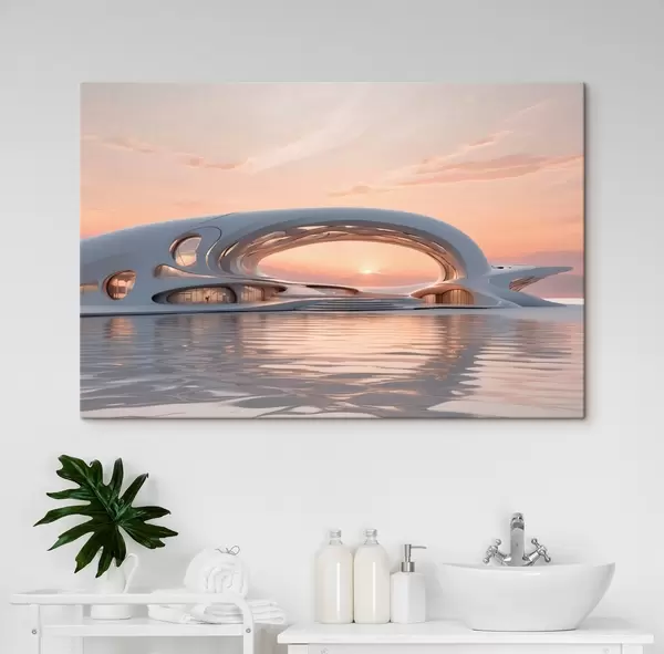 Obraz Futuristická budova na vodě na pozadí růžového západu slunce Č. s44884