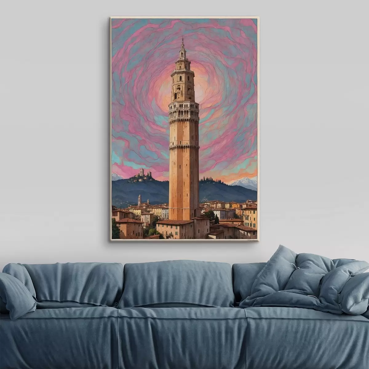 Obraz Fantasy věž na pozadí oblohy s růžovými a modrými spirálami Č. s44885