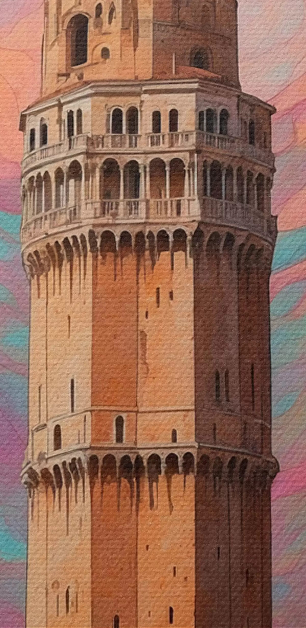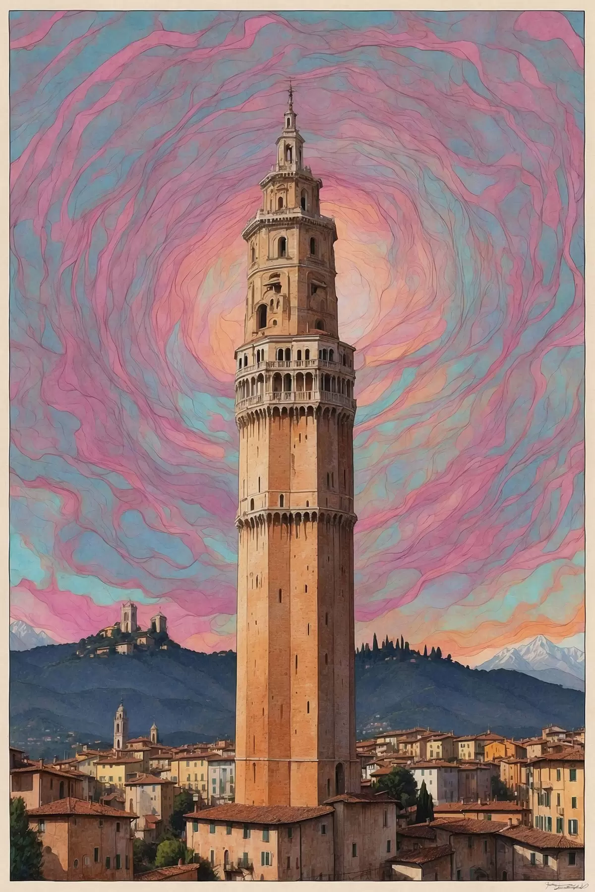 Obraz Fantasy věž na pozadí oblohy s růžovými a modrými spirálami Č. s44885