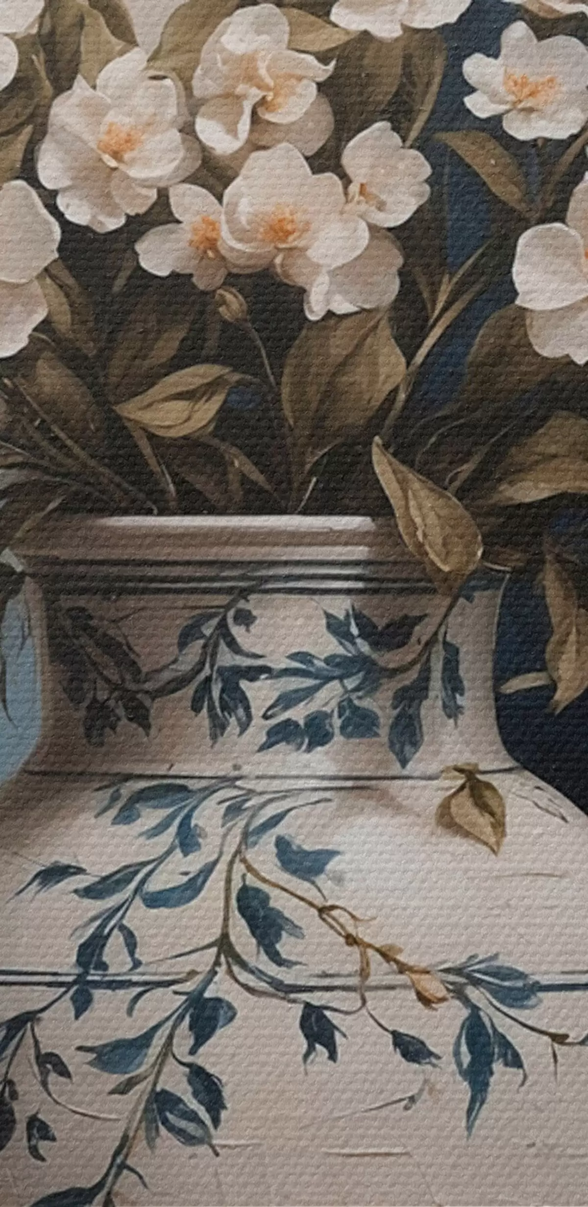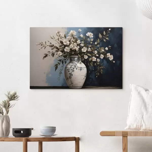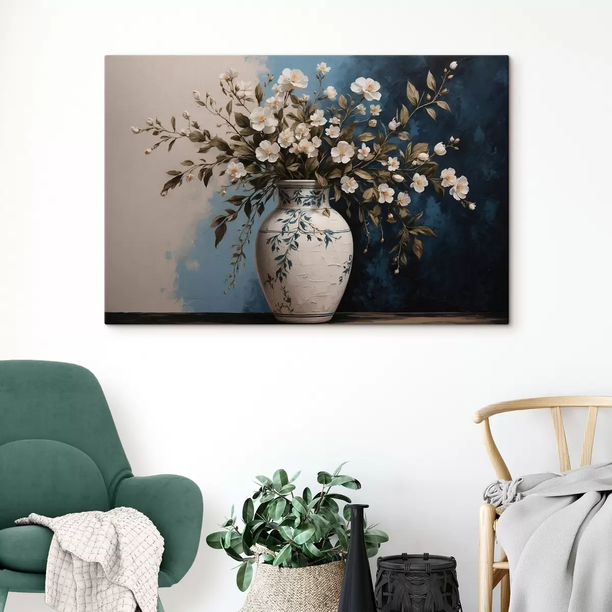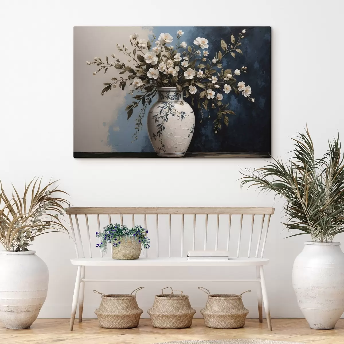 Obraz Bílé a žluté květy ve velké váze na modrém pozadí Č. s44893