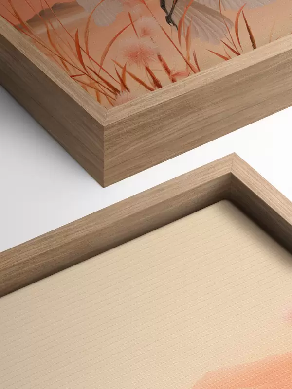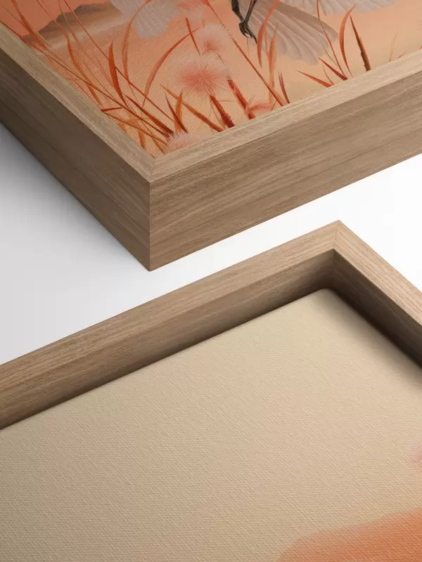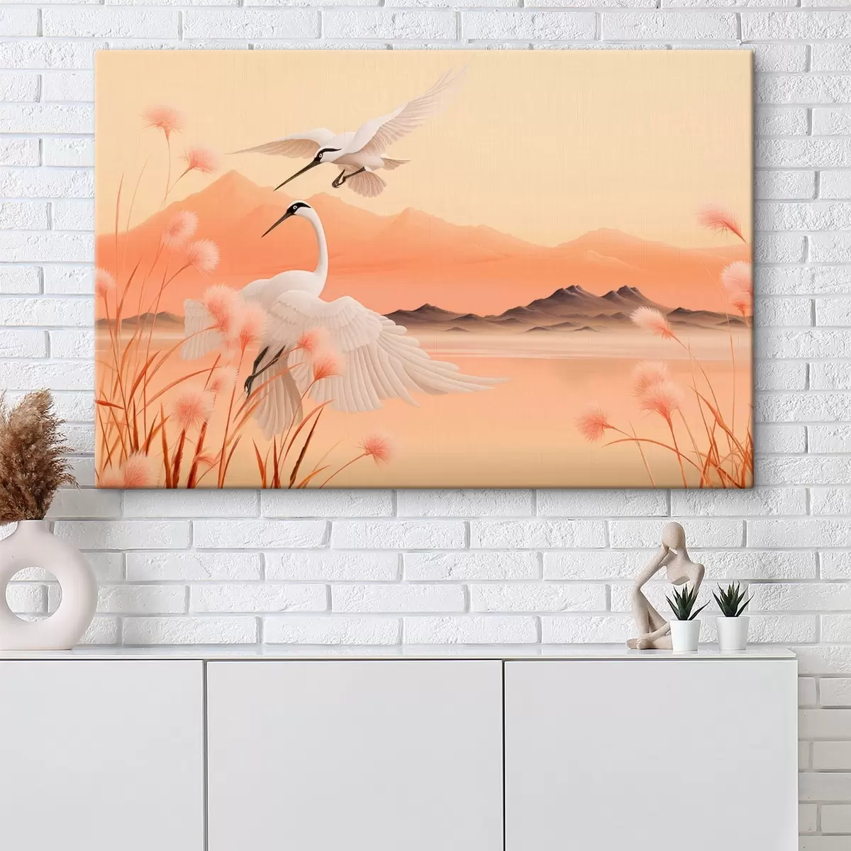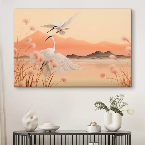 Obraz Bílí jeřábi s růžovým rákosím v popředí, hory a jezero v pozadí, měkké oranžové světlo Č. s44925